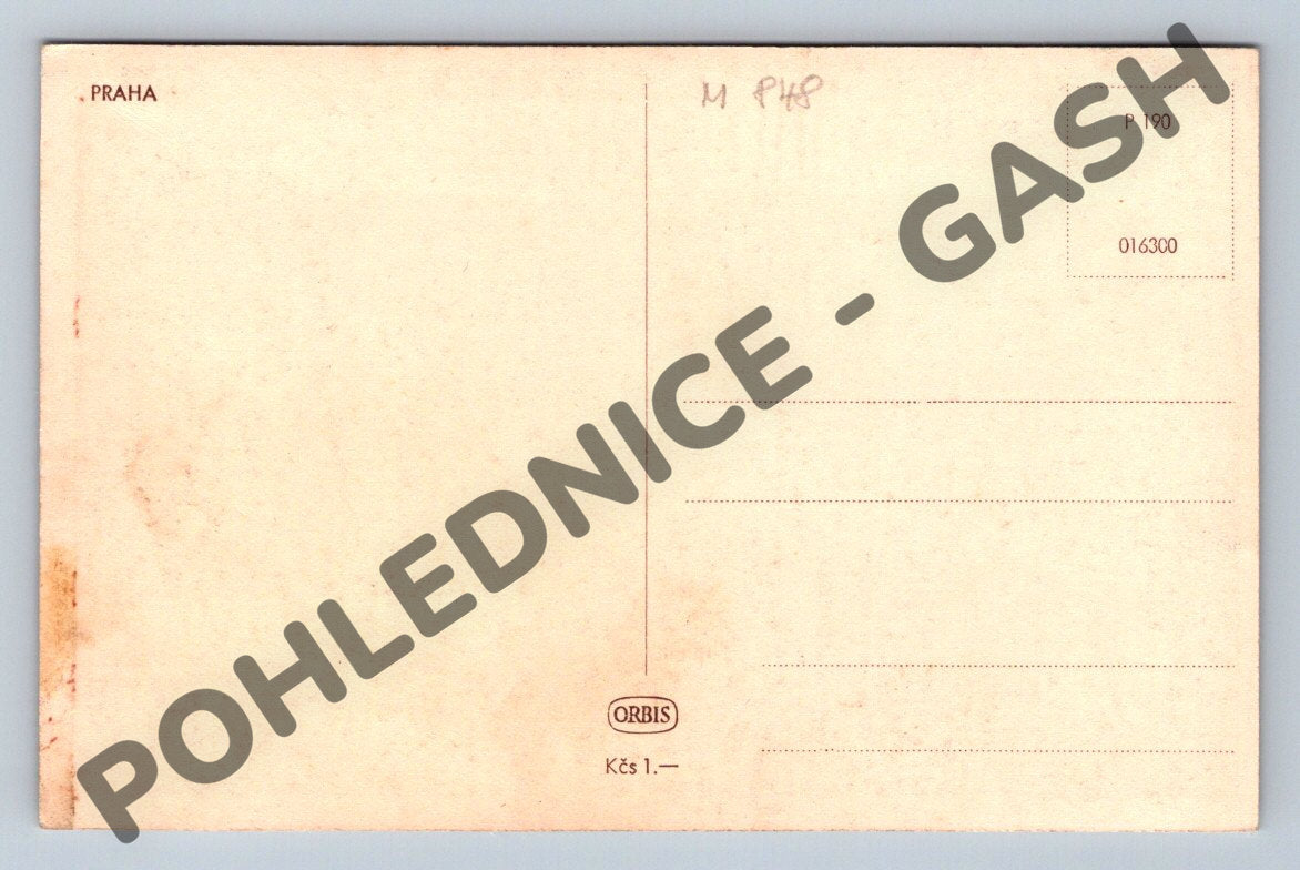 Originální černobílá pohlednice znázorňující historické panorama Prahy s Karlovým mostem, Vltavou a Pražským hradem v pozadí. V pravé části pohlednice je zachycena část známé budovy a u břehu řeky podél hráze. Na zadní straně je nápis Praha a vydavatelská značka Orbis, cena pohlednice 1 Kčs. Pohlednice je neprošlá a není popsána. Celkově v dobrém stavu, mírné stopy stáří a opotřebení na okrajích. Skvělý sběratelský kousek pro milovníky historie města Prahy a starých pohlednic.