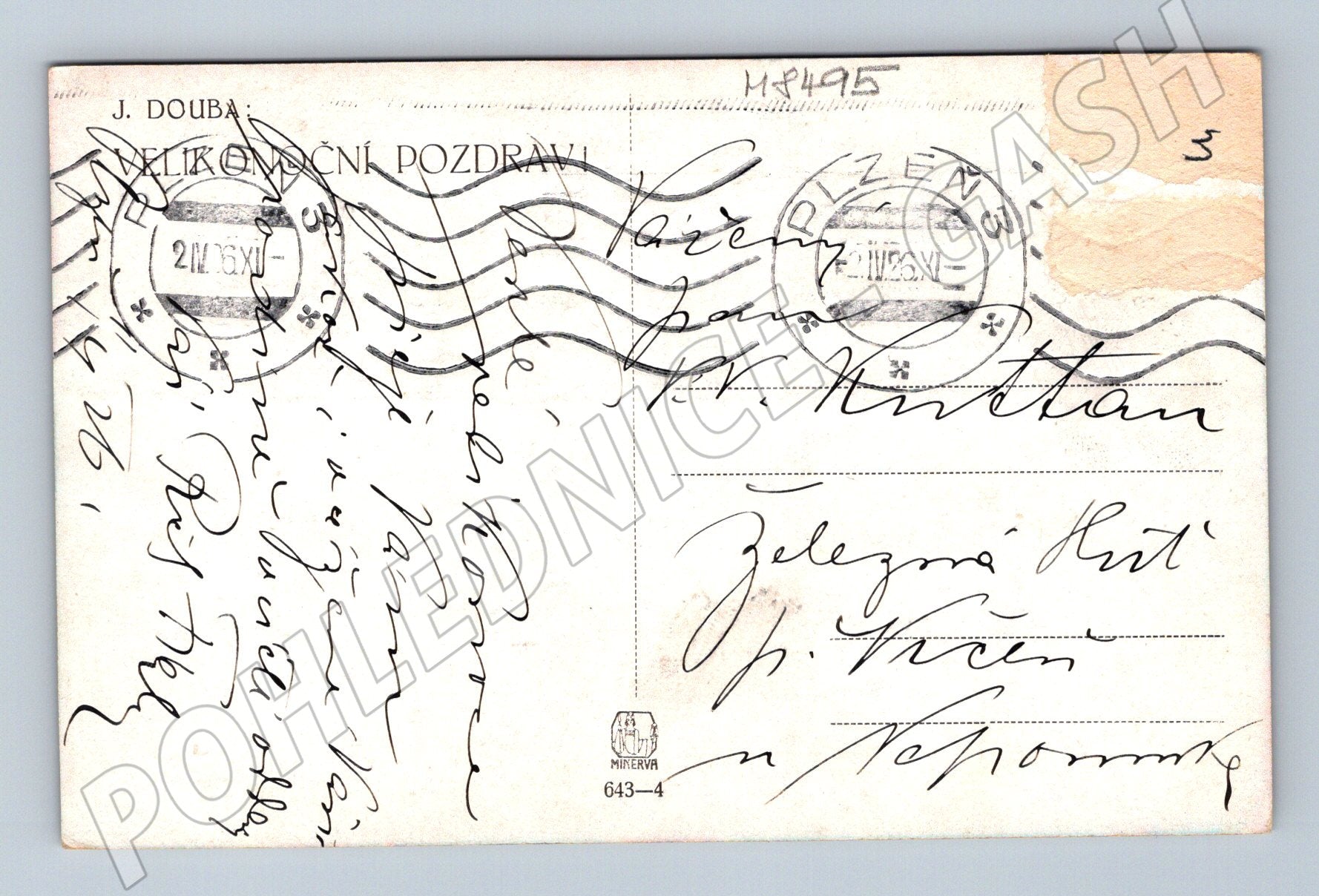 Starobylá velikonoční pohlednice z roku 1925 zachycující motiv tradiční české tradice - dívky v lidových krojích s pomlázkami v jarní krajině. Krásně barevná kresba znázorňuje ručně malovaný etnografický námět z venkova. Pohlednice je prošlá poštou, zadní strana nese čitelná razítka a rukopisné přání s označením místa odeslání (Plzeň). Okraj pohlednice je lehce opotřebovaný, pravý horní roh nese stopy po lepení. Ideální k rozšíření sbírky tematických velikonočních nebo etnografických pohlednic.