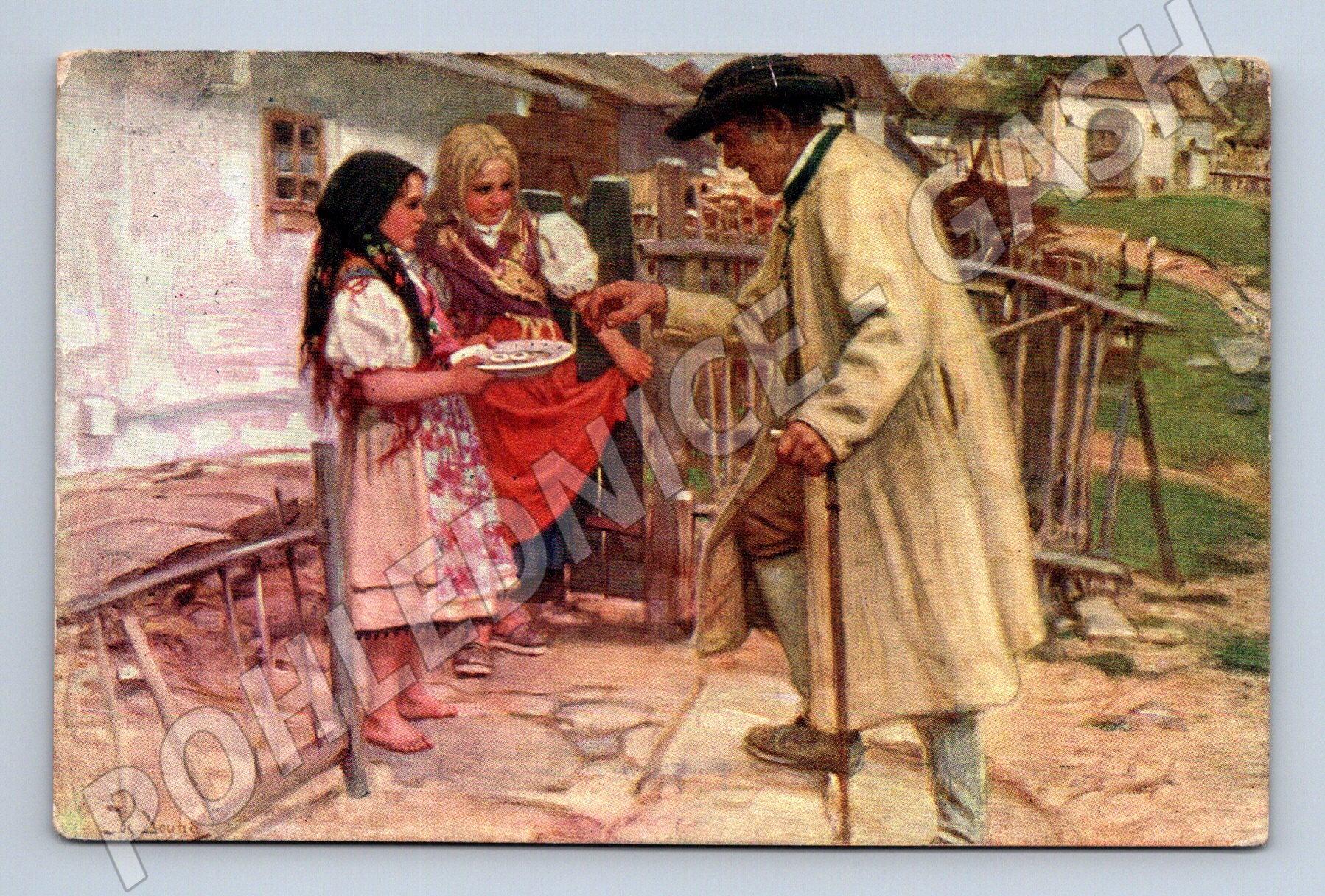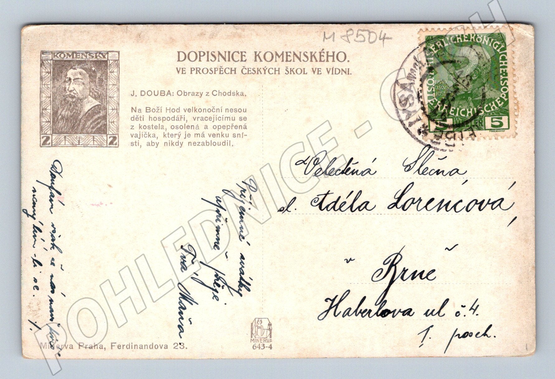 Velikonoční pohlednice s etnografickým motivem podle obrazu J. Douby zachycuje tradiční zvyk z Chodska. Na lícní straně je vyobrazen muž v kroji přijímající od děvčat tradičně upravené vejce během velikonočních svátků. Scéna probíhá na venkovském dvorku s typickými chalupami v pozadí. Pohlednice byla odeslána a obsahuje rukopisný text a známku z Rakouska-Uherska. Na zadní straně je kromě adresy i krátký popis tradice. Krásný sběratelský kus představující český venkov a tradice začátku 20. století.