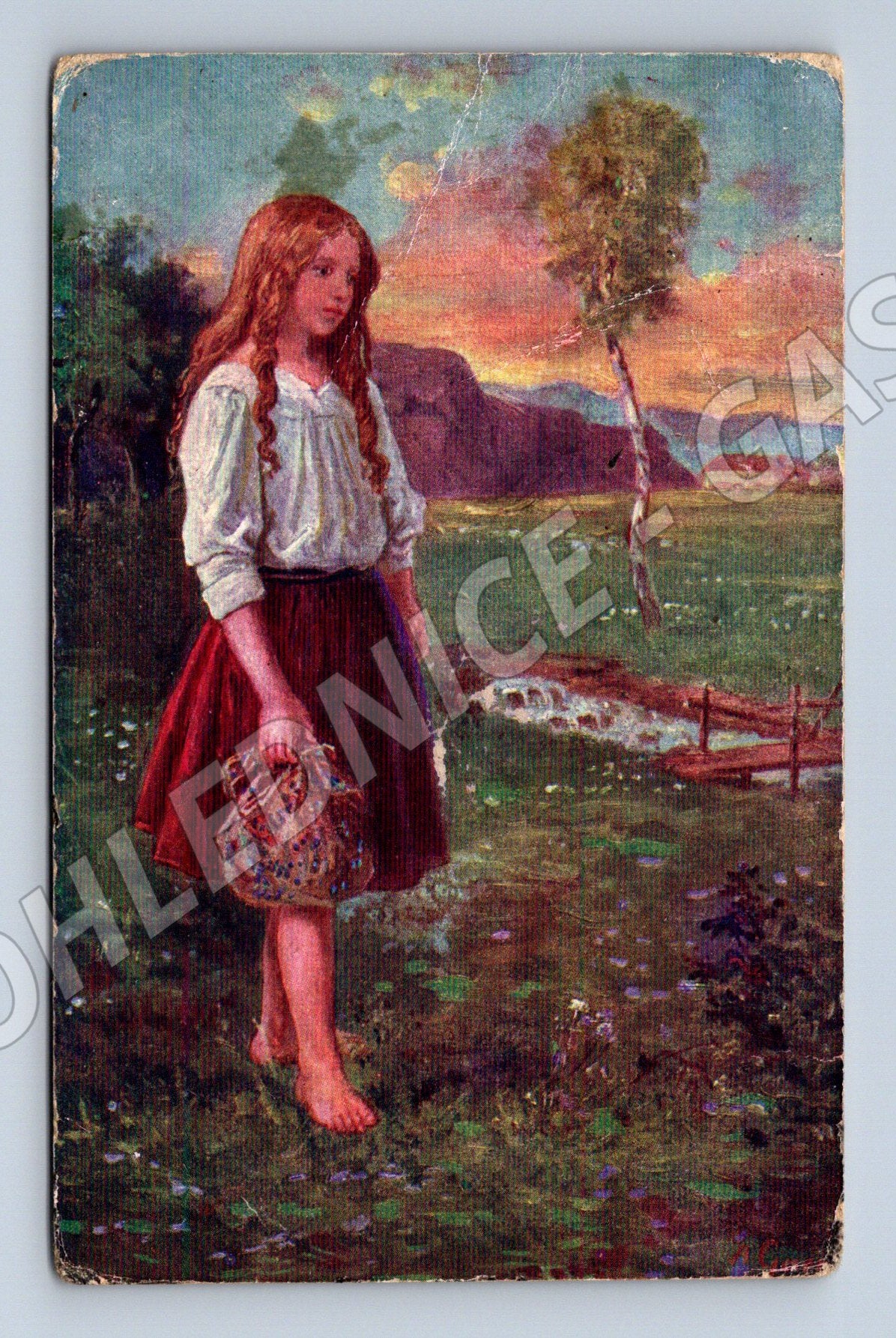 Nabízím starou pohlednici s názvem Mignon od malíře A. Gareise. Pohlednice zobrazuje dívku v krajině za soumraku, malovanou technikou evokující olejomalbu. Na zadní straně je ručně psaný text, odeslaný s razítkem a známkou, adresováno slečně Hele Lebedové v Makově u Litomyšle. Pohlednice nese známky stáří, mírné opotřebení a otřepy na okrajích. Vhodné pro sběratele historických pohlednic či milovníky výtvarného umění.