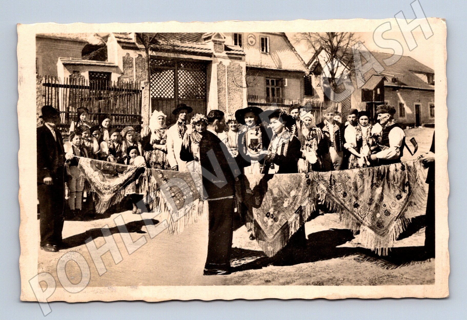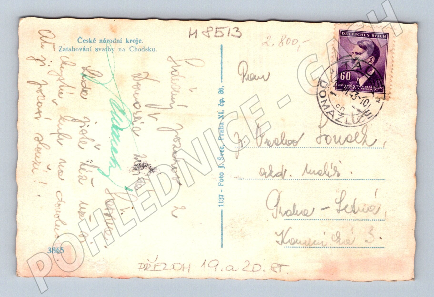 Originální stará pohlednice s etnografickým námětem. Na přední straně je zachycena scéna z tradiční svatby na Chodsku s názvem České národní kroje – Zatahování svatby na Chodsku . Pohlednice ukazuje skupinu lidí ve slavnostních krojích při svatebním obřadu na českém venkově. Zajímavá je i ručně psaná korespondence na zadní straně a poštovní razítko s německou známkou období Protektorátu. Jedná se o autentický historický dokument z meziválečného či válečného období vhodný pro sběratele etnografie a starých pohlednic. Stav je odpovídající stáří, pohlednice je prošlá poštou.