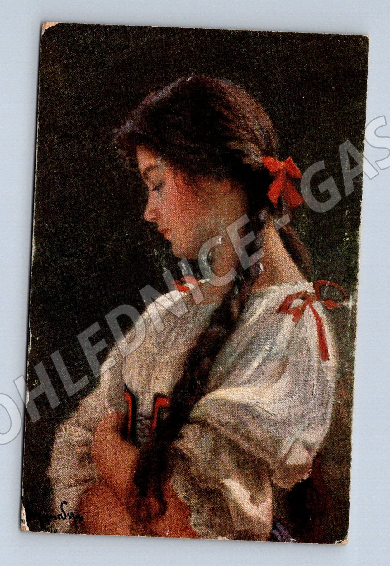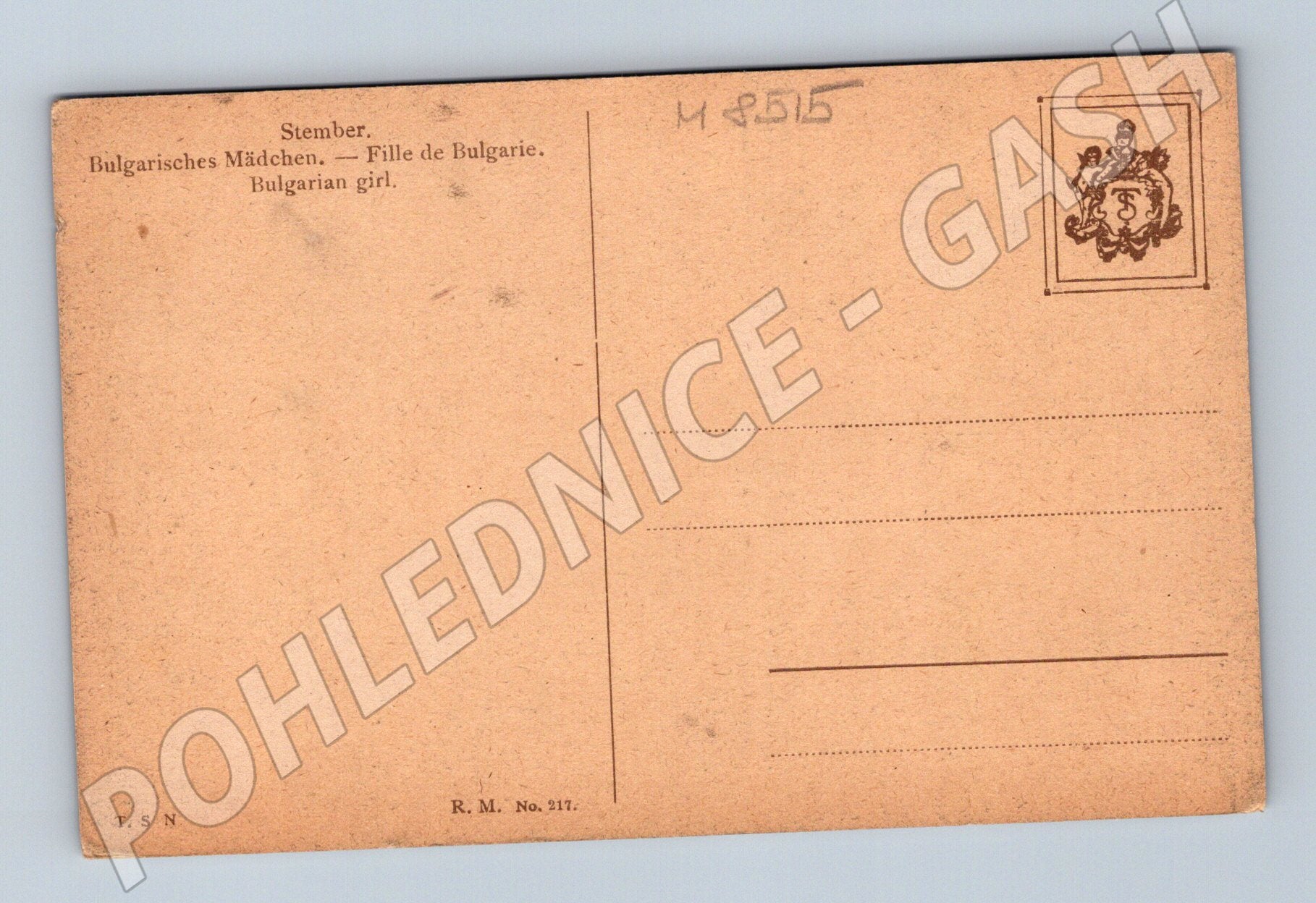 Starší pohlednice s etnografickým motivem znázorňující bulharskou dívku v tradičním kroji. Umělecká malba zobrazuje dívku se spleteným copem a červenými stuhami, jak je uvedeno i na zadní straně v několika jazycích (Stember. Bulgarisches Mädchen. Bulgarian girl). Na zadní straně pohlednice je místo pro známku i pro adresu. Vhodné pro sběratele pohlednic s etnografickou nebo balkánskou tematikou.