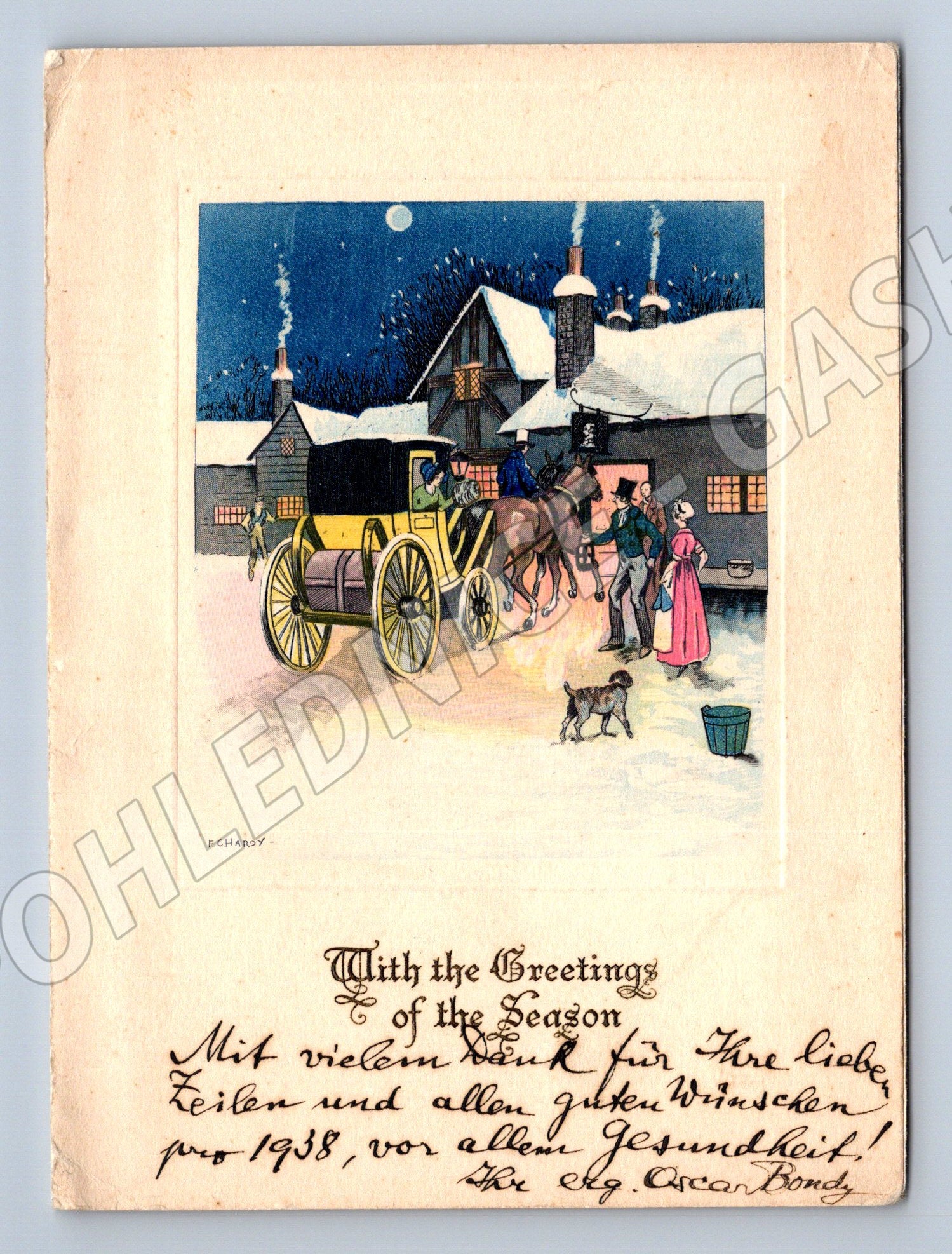 Originální stará pohlednice s vánoční tématikou a zimní scénou, na které je vyobrazena dostavníková pošta tažená koňmi. V pozadí jsou zasněžené střechy a noční zimní krajina, podtrhující historickou atmosféru. Vlevo jsou anglické pozdravy a ručně psané německé věnování z roku 1938. Pohlednice je ve velmi dobrém stavu s patinou a drobnými stopami stáří, zadní strana čistá, bez známky a adresy. Vhodné pro sběratele dobových a historických pohlednic a milovníky motivů dopravy či zimní atmosféry.