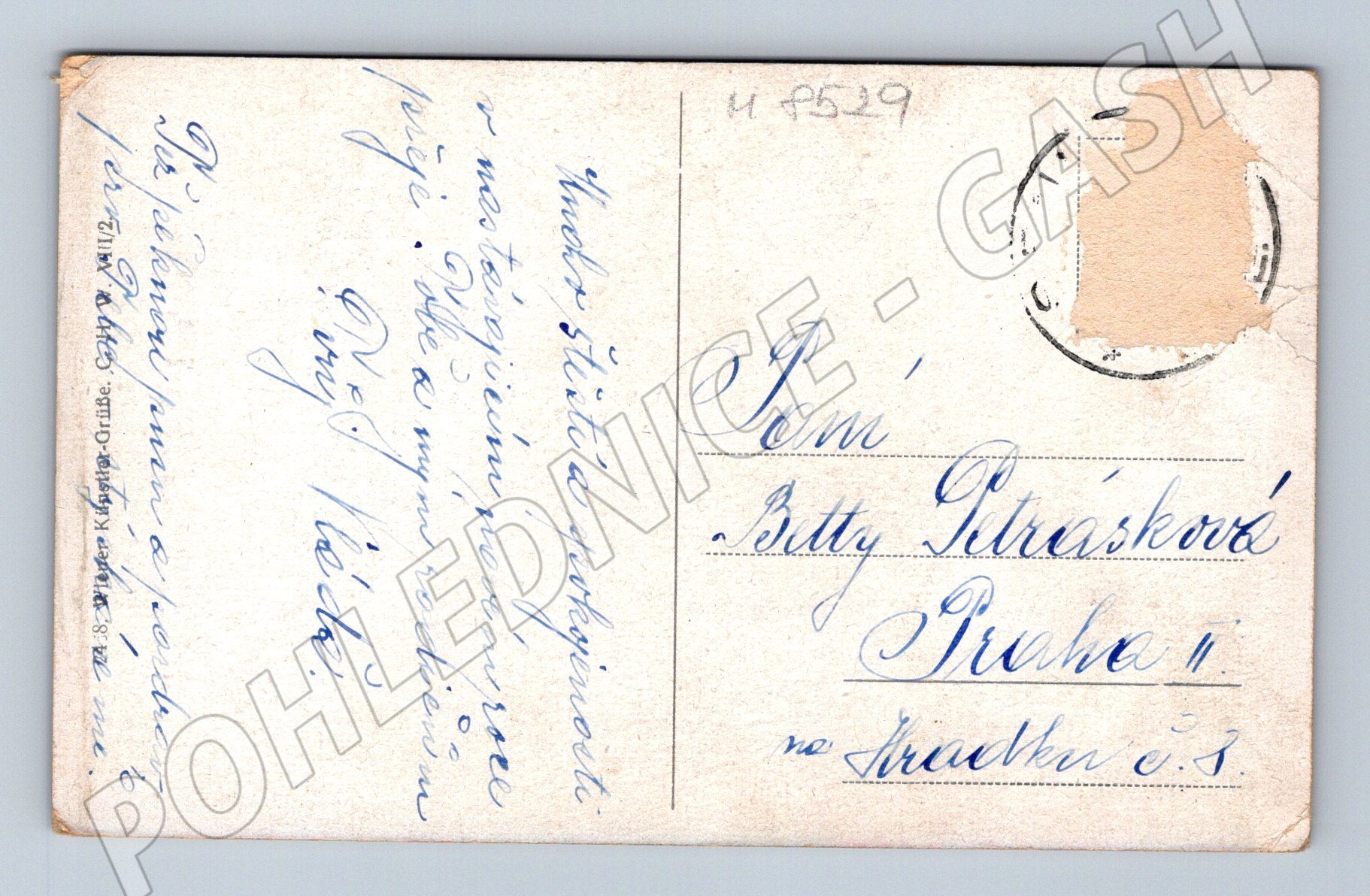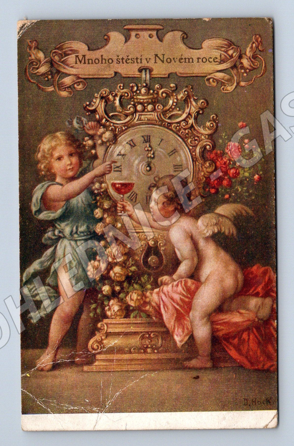 Starobylá česká novoroční pohlednice s tématem andělíčků u hodin odbíjejících půlnoc, symbolizující začátek nového roku. Na pohlednici je nápis Mnoho štěstí v Novém roce . Původní malovaný motiv v secesním stylu, bohatě zdobený rámy a květinami. Pohled je adresován na paní Bittu Petřáskovou v Praze, datován přelom 19. a 20. století. Zadní strana s původním ručně psaným textem a zbytky poštovní známky, známky stáří a oběhu (otřepy, drobné oděrky, lehké zlomy v rozích). Krásná sběratelská položka s historickou hodnotou.