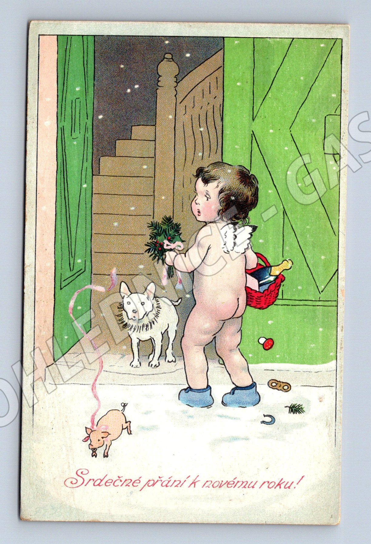 Starobylá pohlednice z Československa s motivem novoročního přání. Na přední straně je barevná ilustrace dítěte hrajícího si se zvířátky u schodů, v zimní atmosféře se sněhem, s věnováním Srdečné přání k novému roku! Pohlednice je ručně psaná, byla odeslána v roce 1922 z Kutné Hory do Kolína a nese originální známku a poštovní razítko. Hezký sběratelský stav, drobné známky stáří odpovídající věku. Skvělý kousek pro sběratele historických pohlednic, ukázka dobového rukopisu i ilustrace.