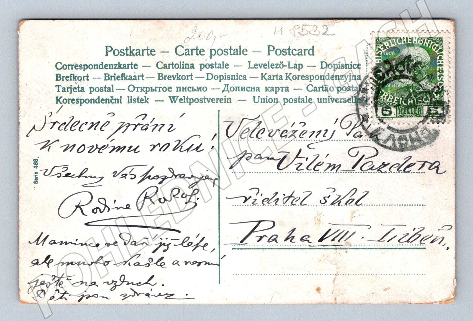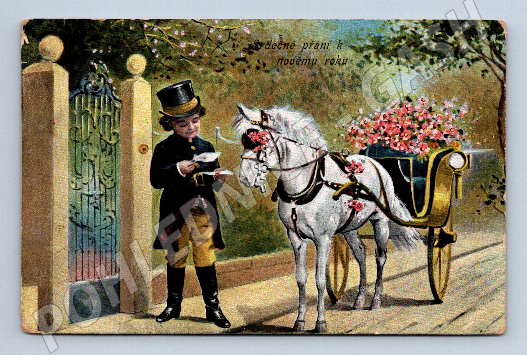 Originální starobylá pohlednice s motivem kočáru taženého bílým koněm a chlapcem v dobovém oblečení. Pohlednice je využita jako novoroční přání, na přední straně je český text Srdečné přání k novému roku“. Na zadní straně naleznete ručně psané vzkazy, adresu a známku z Rakouska-Uherska s razítkem. Pohlednice pochází z období počátku 20. století. Jedná se o sběratelsky atraktivní kousek, který potěší milovníky historických pohlednic, koní i krásných ilustrací. Stav je odpovídající stáří – drobné otlaky rohů, viz foto.