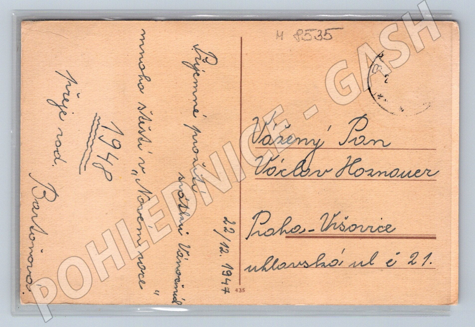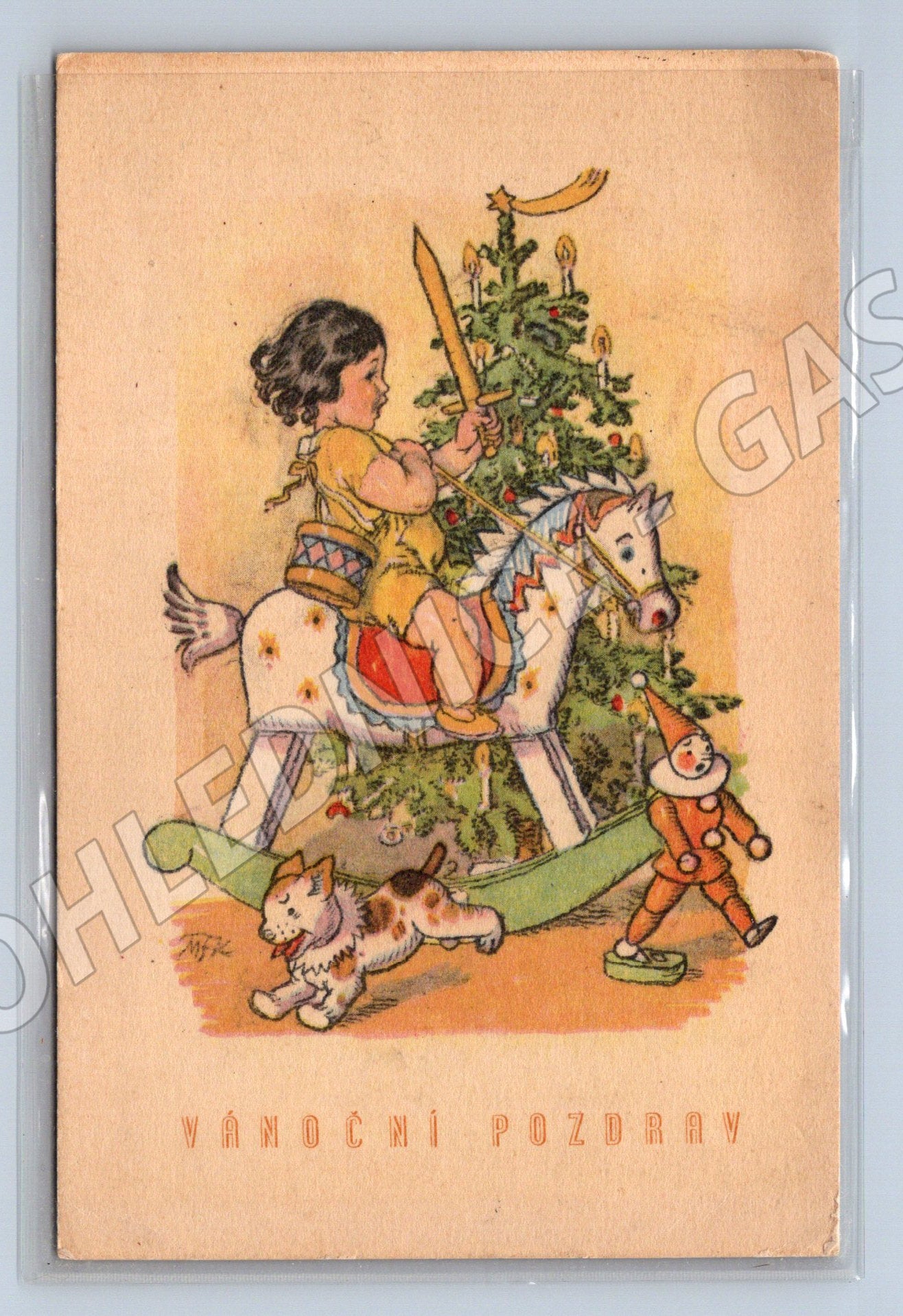 Vánoční pohlednice z roku 1947 s malovaným motivem dítěte, houpacího koně, kočky a vánočního stromku. Pohlednice nese přání k Vánocům a Novému roku, psané rukou, včetně data 22. 12. 1947. Odesláno na adresu v Praze. Pohlednice je malého formátu a zachycuje atmosféru českých Vánoc v polovině 20. století. Výborný sběratelský kousek pro milovníky historických pohlednic a vánočních motivů.