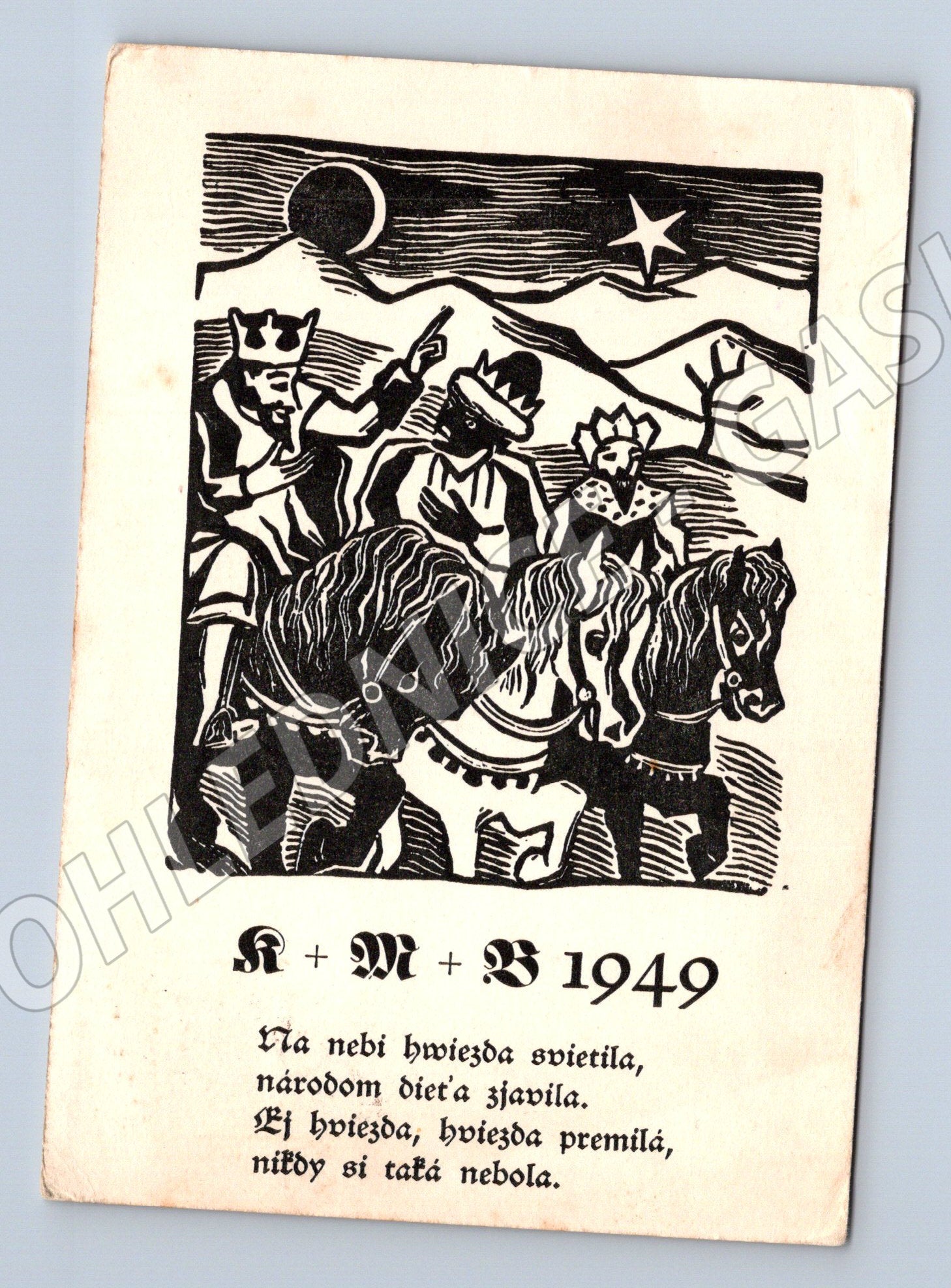 Originální česká pohlednice ze sbírky Sdružení katolické mládeže v Československu, odeslaná v roce 1949. Pohlednice má rozměr malého formátu a na přední straně je grafika s náboženským nebo svátečním motivem (Tři králové) s textem koledy. Zadní strana je vyplněna originálním rukopisem a opatřena československou známkou a razítkem z roku 1949. Vhodné pro sběratele historických pohlednic z období první poloviny 20. století.
