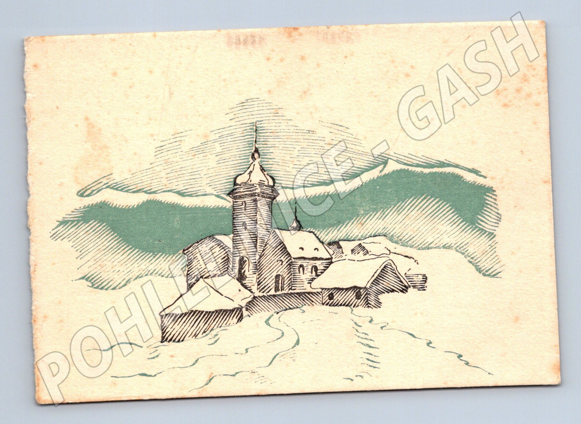 Nabízím starou pohlednici s kresbou zasněženého hradu nebo kostela, která je provedena ve stylu linorytu v kombinaci černé a zelené barvy. Na pohlednici je motiv historické budovy s dominantní věží a zimní krajinou. Zadní strana je nepopsaná, v horním rohu je pouze číselné označení H 8546. Pohlednice nese stopy stáří, na povrchu jsou drobné skvrny a znaky zažloutnutí odpovídající patině starého papíru. Vhodné pro sběratele historických pohlednic nebo jako dekoraci s nostalgickou atmosférou minulých zim.