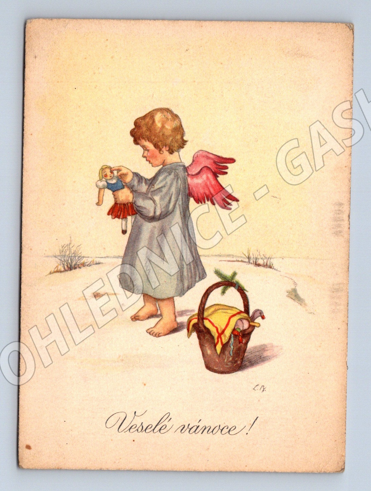 Starobylá česká vánoční pohlednice v malém formátu, zaslaná ve 30. nebo 40. letech 20. století. Na přední straně pohlednice je vyobrazena malovaná scéna s andílkem nesoucím panenku a vánoční dárky v koši. Nápis Veselé vánoce! dokresluje sváteční atmosféru. Rubová strana je popsána, opatřena dobovou poštovní známkou a adresována do Prahy. Jedná se o krásný kus sumněřeného stáří a atmosféry první poloviny 20. století. Vhodné pro sběratele starých pohlednic, milovníky vánočních motivů nebo pro nostalgické dekorace.
