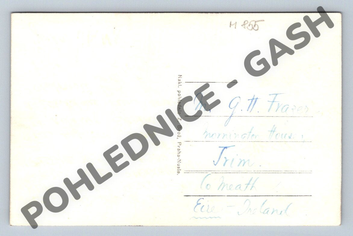 Starý černobílý pohled na Staroměstské náměstí v Praze. Na pohlednici je výrazně zobrazena Staroměstská radnice s orlojem a kostel sv. Mikuláše. Fotografie nabízí krásný celkový pohled na historické centrum Prahy. Pohlednice je ve velmi dobrém stavu, byla zaslaná a popsaná (adresována do Irska). Výrobce: Z. Brož, Praha-Nusle. Ideální pro sběratele historických pohlednic Prahy a milovníky architektury. Formát malý, cca do roku 1950.