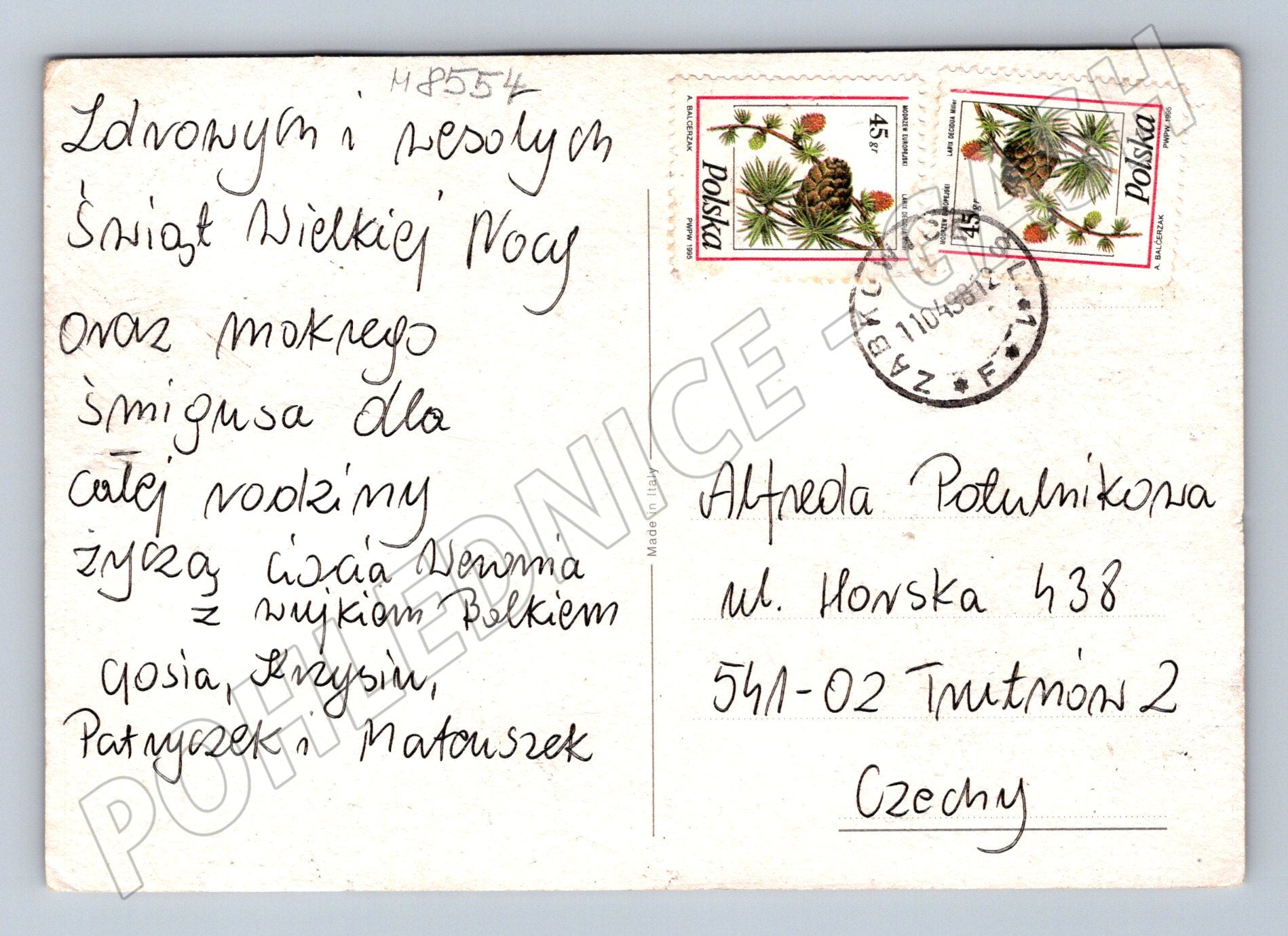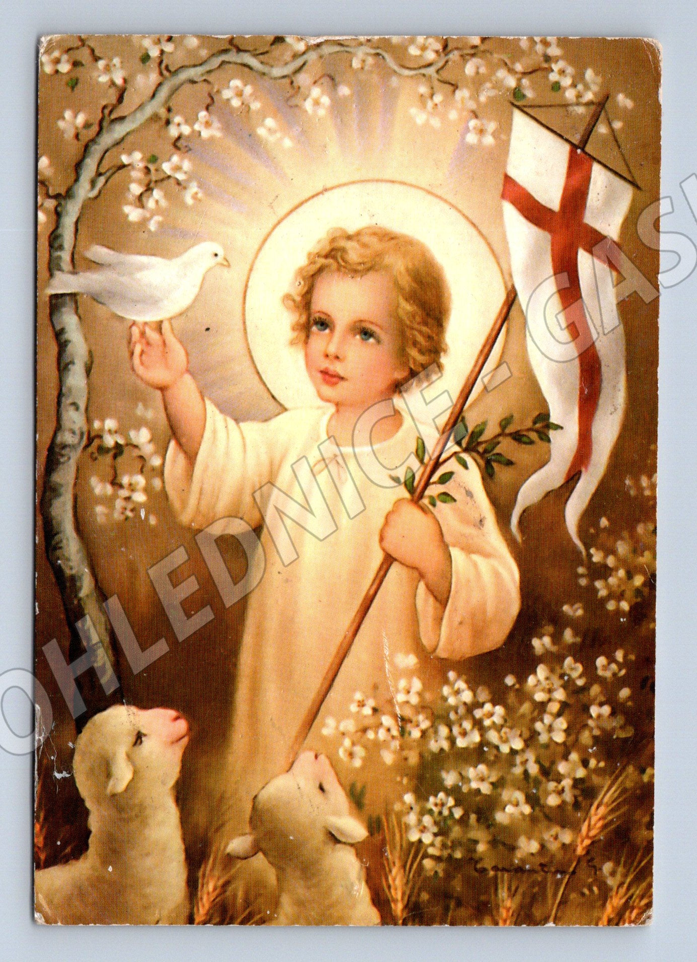 Velikonoční pohlednice s náboženským motivem – Ježíškem, jehnětem a holubicí. Pohlednice je ručně psaná a opatřena dvěma polskými známkami s rostlinným motivem. Na zadní straně přání k Velikonocům v polštině, zaslané do České republiky (Trutnov) a orazítkované roku 1981. Krásně ilustrovaná přední strana, detailní kresba a zlaté třpytivé prvky. Vhodné pro sběratele historických pohlednic, velikonočních motivů a tematických přání. Zachovalý stav odpovídající stáří, drobné opotřebení hran.
