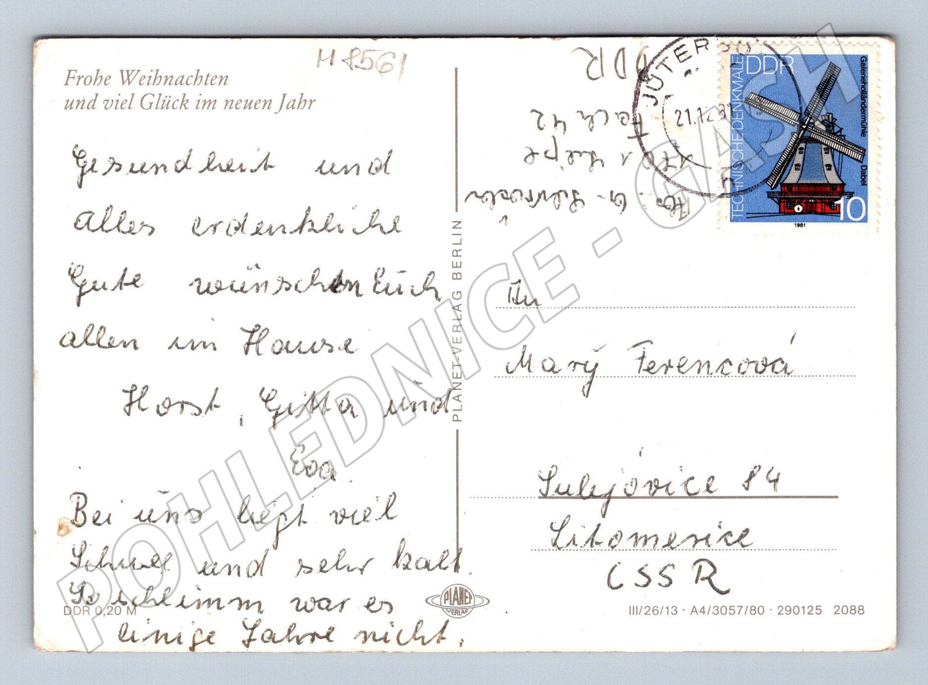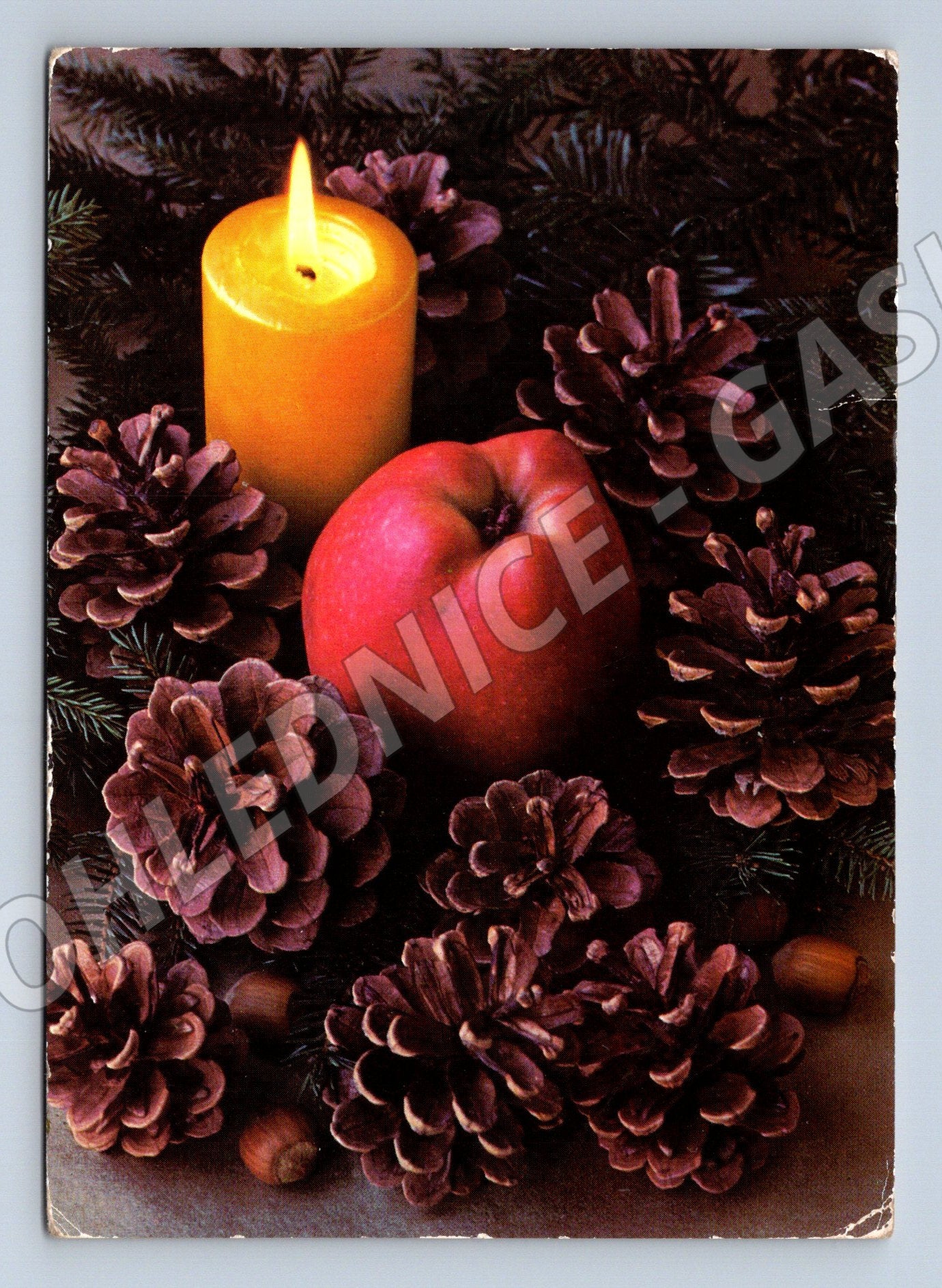Originální pohlednice s vánoční tematikou z bývalé Německé demokratické republiky (DDR), datovaná rokem 1981. Na přední straně pohlednice je výrazně zachycená žlutá svíčka, červené jablko, smrkové větvičky a šišky, což vytváří typickou zimní a sváteční atmosféru. Zadní strana obsahuje ručně psané věnování v němčině, poštovní známku s motivem větrného mlýna a poštovní razítko z Jüterbogu, DDR. Adresováno do Československa (Litoměřice). Sbírkově zajímavý kus ilustrující dobovou kulturu a mezinárodní korespondenci.
