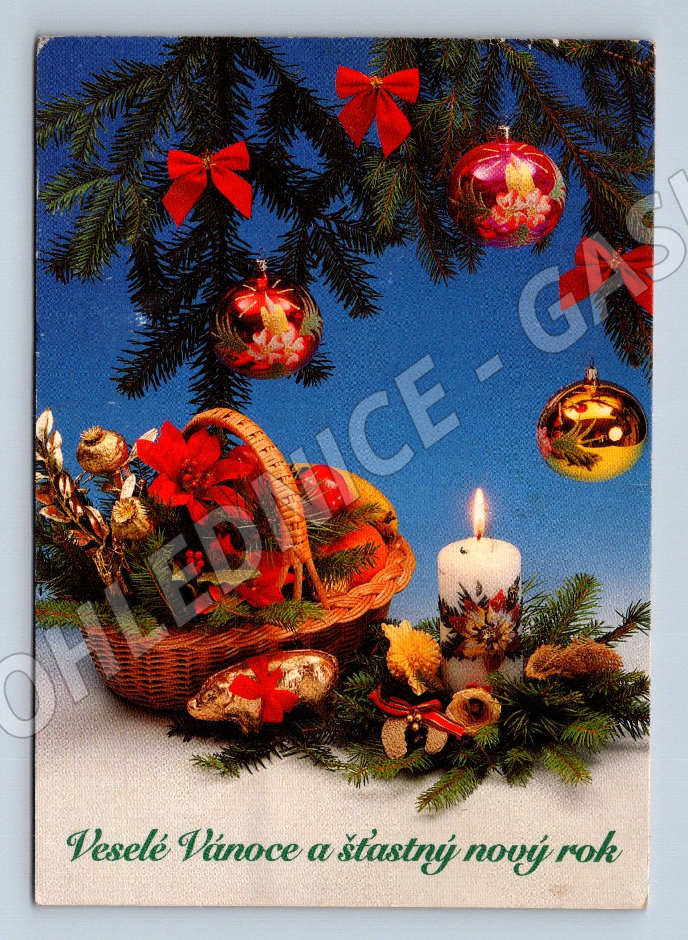 Originální česká pohlednice s vánoční tematikou z konce 20. století. Na přední straně je barevný motiv s vánoční dekorací – svíčka, stromeček, baňky a košík s přírodními ozdobami, doplněno nápisem Veselé Vánoce a šťastný nový rok . Zadní strana je popsána, opatřena poštovní známkou České republiky a razítkem s datem odeslání 20.12.1999 z Humpolce. Pohlednice je vhodná do sbírky svátečních a novodobých českých pohlednic, nebo jako památka na devadesátá léta. Stav odpovídá stáří – viz foto.