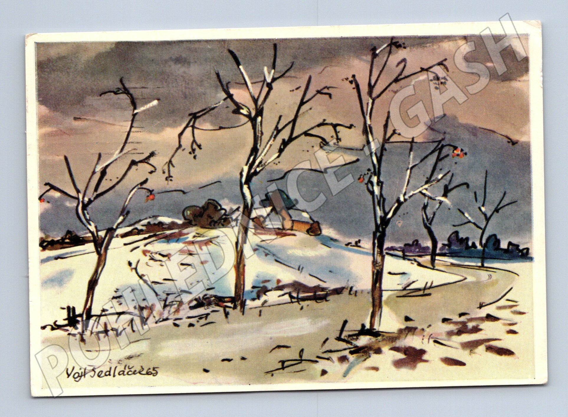 Pohlednice s krásnou zimní krajinou od výtvarníka Vojtěcha Sedláčka. Pohlednice je kolorovaná a vyobrazuje zasněženou cestu lemovanou stromy, v pozadí se nachází stavení. Přední strana je signovaná autorem. Zadní strana obsahuje ručně psaný vzkaz, je prošlá poštou včetně známky a razítka z roku 1966. Ideální jako sběratelský kousek, ukázka českého malířství i dobové korespondence. Stav viz foto, drobné opotřebení odpovídající stáří.