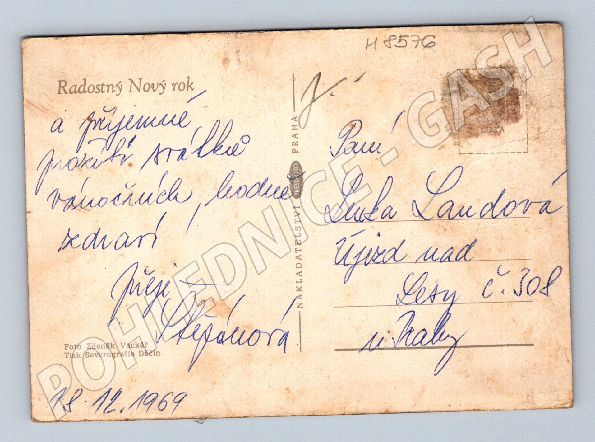 Originální novoroční pohlednice odeslaná v roce 1969. Na přední straně je barevná fotografie s motivem starožitných hodin, papírovými serpentýnami a sklenkou na slavnostně prostřeném stole, což evokuje oslavu příchodu Nového roku. Zadní strana obsahuje ručně psané přání s podpisem a adresou příjemce. Pohlednice byla vytištěna nákladem Foto Zdeněk Vackář, tisk Severografia Děčín. Celkový stav odpovídá stáří – místy drobné oděrky a zašpinění, rohy lehce ohnuté. Skvělá sběratelská položka pro zájemce o historické pohlednice z bývalého Československa a témata novoročních přání.