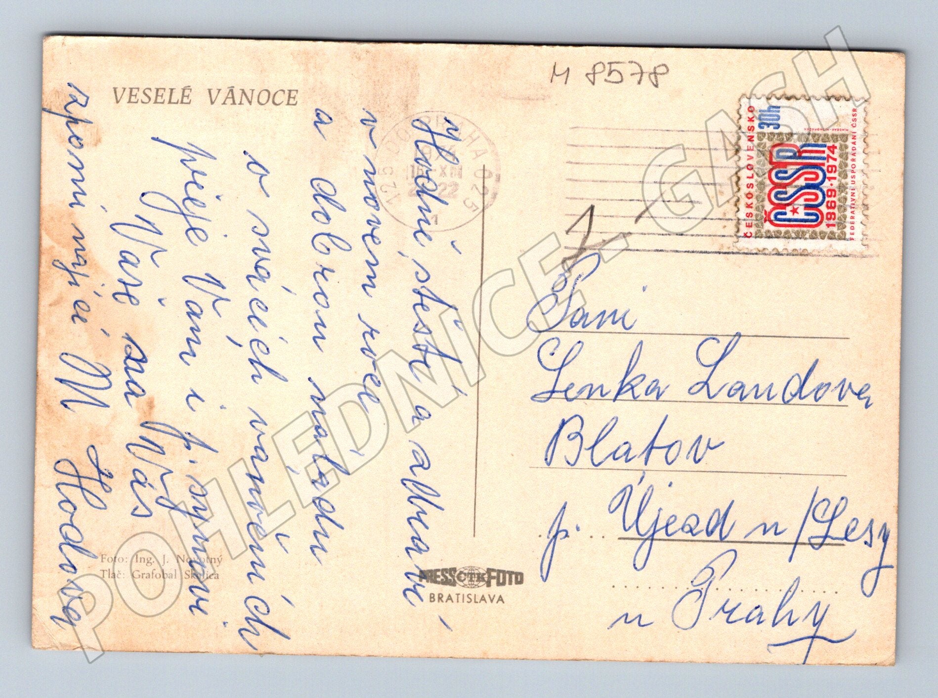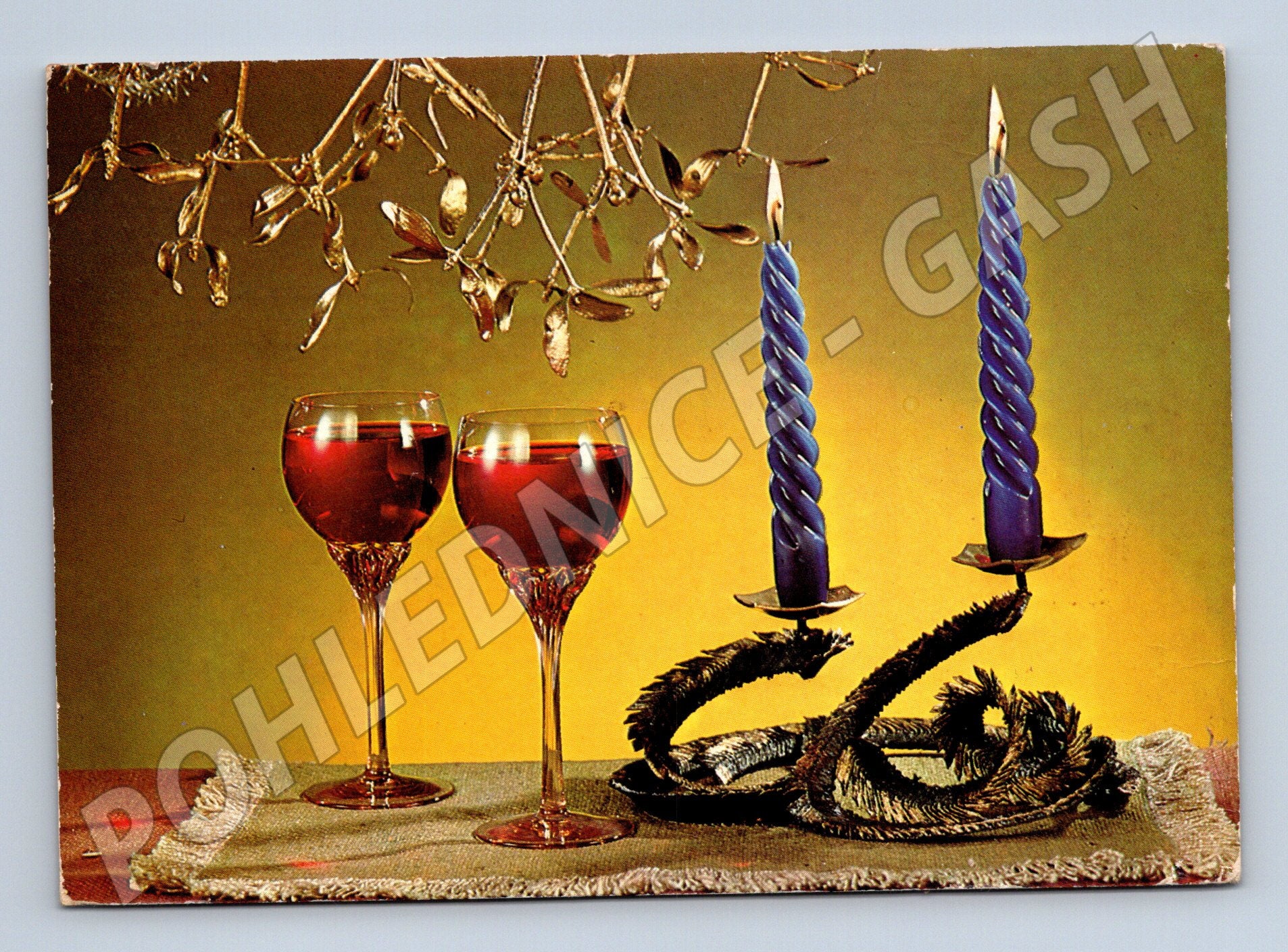 Vánoční pohlednice zaslaná z bývalého Československa, opatřená poštovní známkou a osobním ručně psaným vzkazem. Na přední straně se nachází typická sváteční aranž s dvěma modrými svíčkami v mosazném svícnu, dvěma sklenkami červeného vína a větvičkami jmelí. Pohlednice byla tisknuta v Grafobalu Skalica a fotografie pořídil Ing. J. Novotný. Pohlednice je ve velmi dobrém sběratelském stavu, pouze drobné známky opotřebení odpovídající stáří. Ideální pro sběratele tematických pohlednic s vánoční a retro atmosférou.