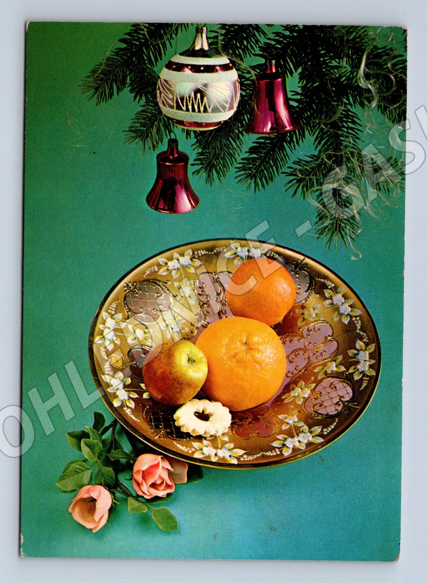 Vánoční pohlednice z tehdejšího Československa s motivem svátečně ozdobené větvičky, miska s ovocem a cukrovím. Na přední straně je barevná fotografie, na zadní ručně psané věnování a známka s razítkem Praha, datované rokem 1976. Pohlednice byla zaslána v rámci České republiky. Celkový stav odpovídá stáří, drobné známky opotřebení, viz foto. Jedná se o pěkný sběratelský kousek s tématikou Vánoc a retronádechem 70. let. Rozměr klasický malý formát.