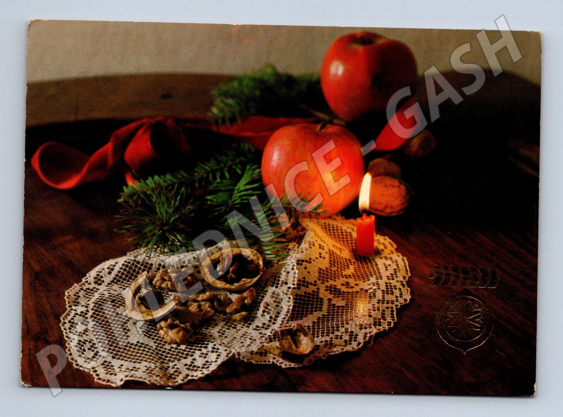 Vánoční pohlednice z Československa s typickým svátečním zátiším. Na přední straně je vyobrazeno tradiční vánoční aranžmá: jablka, ořechy, jehličí, svíčka a ručně háčkovaná krajka na tmavém stole, což evokuje nostalgickou vánoční atmosféru. Zadní strana je popsána, obsahuje známku s razítkem Uherský Brod a ručně psaný sváteční pozdrav v češtině. Pohlednice byla odeslána a nese kolkovou známku 50 haléřů. Skvělý sběratelský artefakt s osobním příběhem i historickou hodnotou.