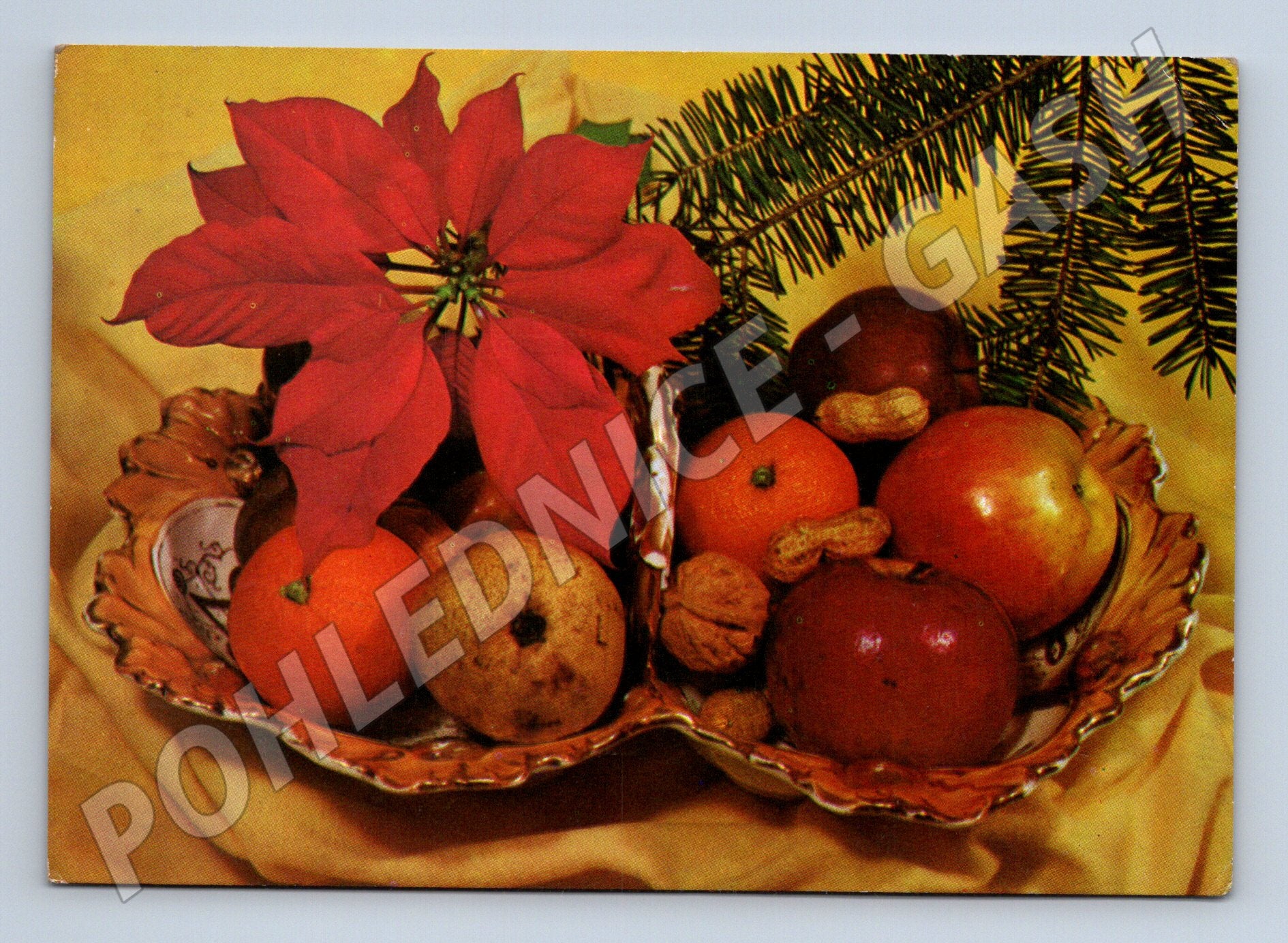 Originální vánoční pohlednice z bývalého Československa s motivem slavnostního ovocného mísy s jablky, pomeranči, vlašskými ořechy a vánoční hvězdou (poinsettia). Výrazný retro design, nápis Veselé Vánoce a šťastný nový rok na zadní straně, známka s motivem 55 let KSČ a poštovní razítko z roku 1976. Pohlednice je vytištěna v Brně, foto J. Žák. Výborně zachovalá, ručně psaný text. Autentický sběratelský kousek pro milovníky historických československých pohlednic a vánočních motivů.