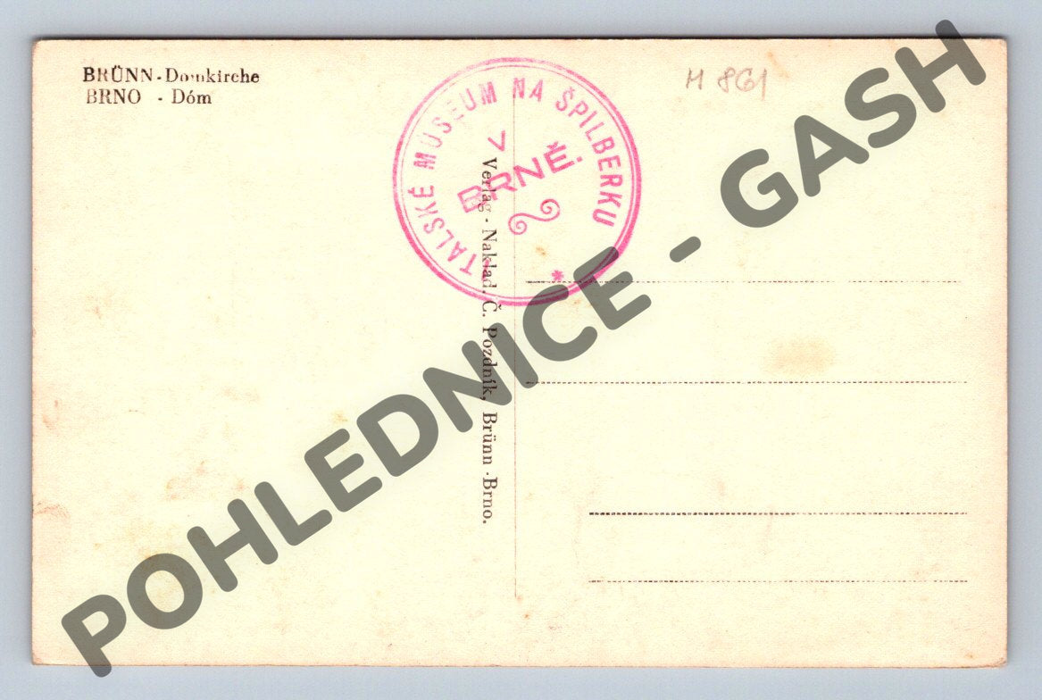 Originální stará pohlednice s motivem zimního pohledu na brněnský Dóm (katedrálu sv. Petra a Pavla). Snímek zachycuje malebné zasněžené stromy v popředí a siluetu známé dominanty města Brna v pozadí. Na zadní straně je originální razítko Městského muzea na Špilberku. Pohlednice je v pěkném stavu, mírné stopy stáří a použití (viz foto). Vydavatel C. Pozdník, Brünn. Vhodné pro sběratele historických pohlednic a milovníky Brna.