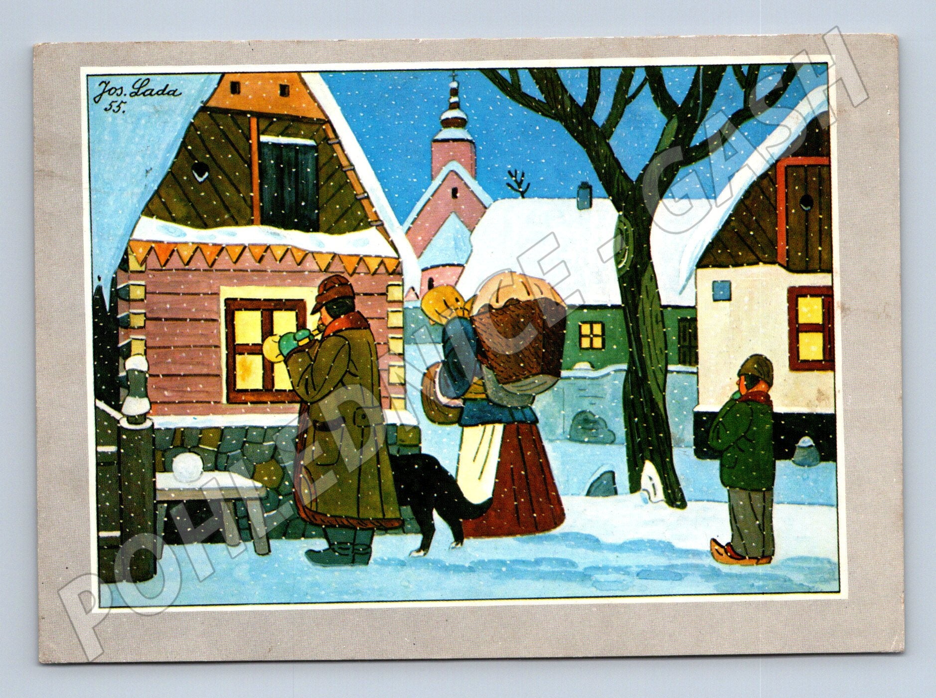 Starší pohlednice s motivem zimní vesnice od známého českého malíře Josefa Lady z roku 1953. Pohlednice je kolorovaná, byla vydána tiskem Severografia Děčín. Na přední straně je typická Ladova zimní idyla s chalupami, postavami venkovanů a zasněženou krajinou. Na zadní straně je rukopisný vzkaz a adresa, včetně poštovního razítka a známky z ČSSR. Jedná se o sběratelsky hodnotnou pohlednici vhodnou do sbírky. Stav viz foto - drobná patina stáří, pěkně zachovalá.