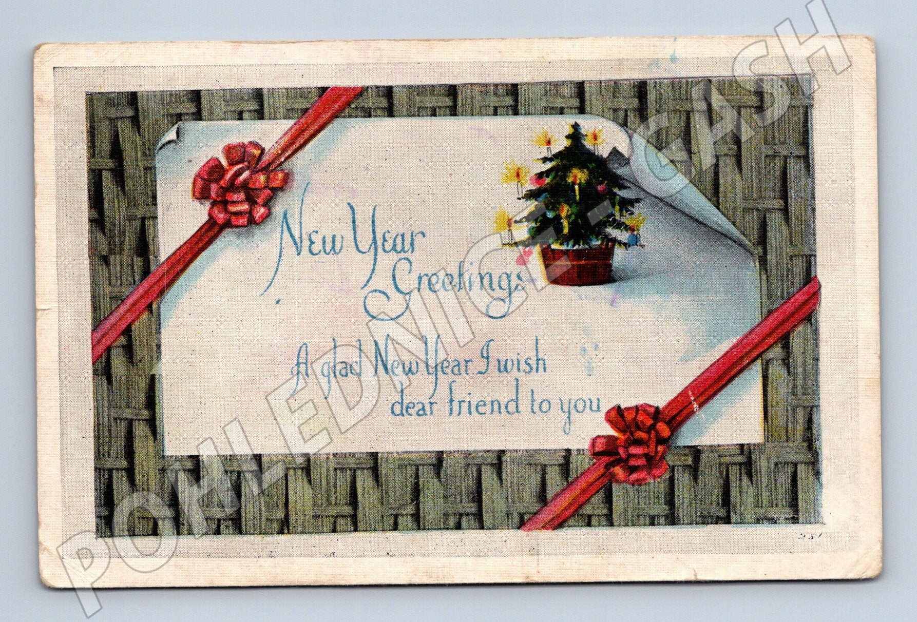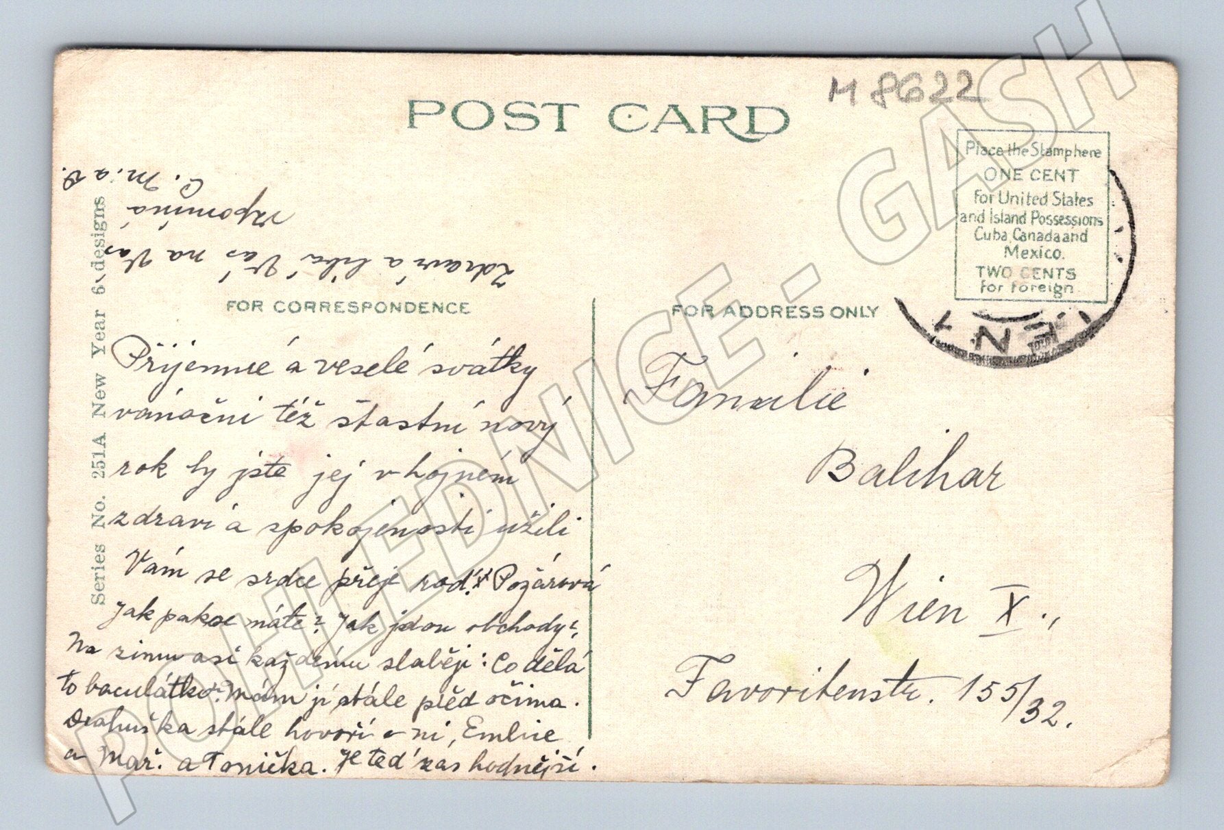 Starobylá novoroční pohlednice s dekorem vánočního stromečku a červenou stuhou. Na přední straně anglický nápis New Year Greetings, A glad New Year I wish dear friend to you , karta je textilně jemně strukturovaná, formát menší než standardní novější pohlednice. Na zadní straně najdete ručně psané přání v češtině adresované do Vídně, Rakousko (rodině Balihar). Pohlednice byla odeslána pravděpodobně mezi lety 1910–1920, podle stylu a ceny poštovného (1 cent, USA) a razítka. Jedná se o krásnou ukázku staré pošty s mezinárodním přesahem, vhodná do sbírky historických pohlednic nebo jako inspirace pro milovníky starých přání.