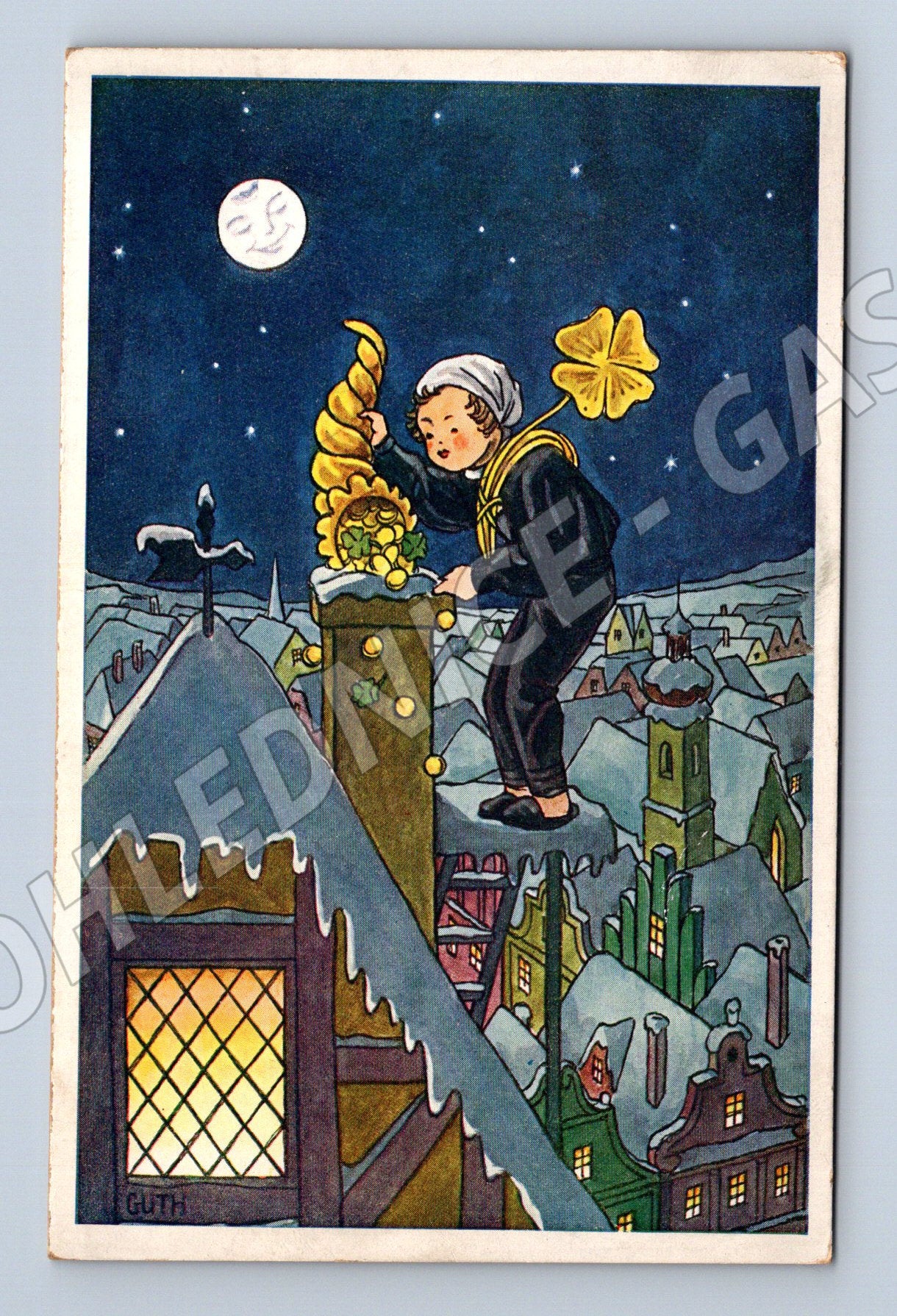 Starší česká pohlednice s vánočním a novoročním motivem. Na lícové straně je malovaná ilustrace chlapce v námořnickém oblečení, který drží roh hojnosti a čtyřlístek, což symbolizuje štěstí, hojnost a naději do nového roku. Noční zimní scéna s měsíčním svitem je dílem akademického malíře Zdeňka Gutha. Na rubu přání: Příjemné a šťastné svátky vánoční, jakož i mnoho dobra a radosti do nového roku upřímně přeje . Vydal spolek Komenský v Praze. Pohlednice je v dobrém historickém stavu, vhodná pro sběratele i milovníky starých ilustrací.