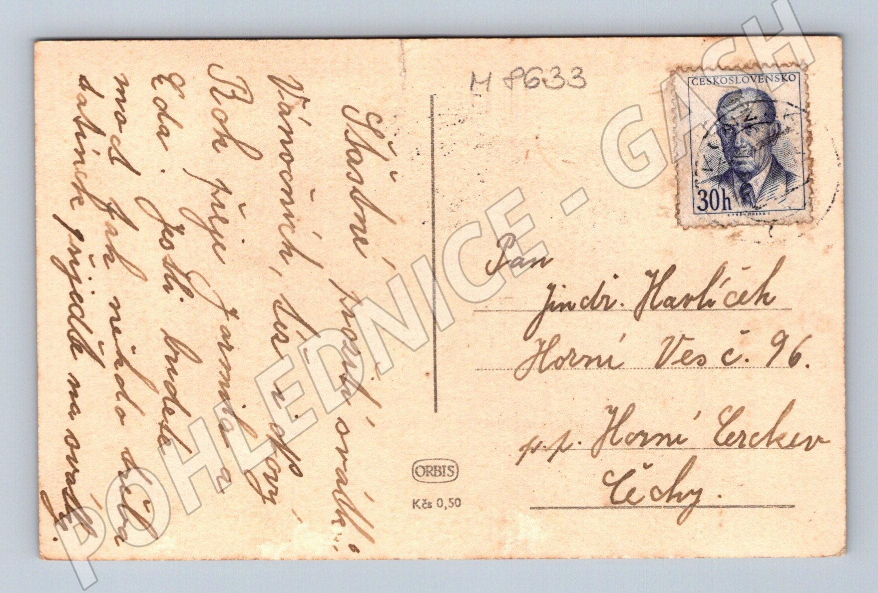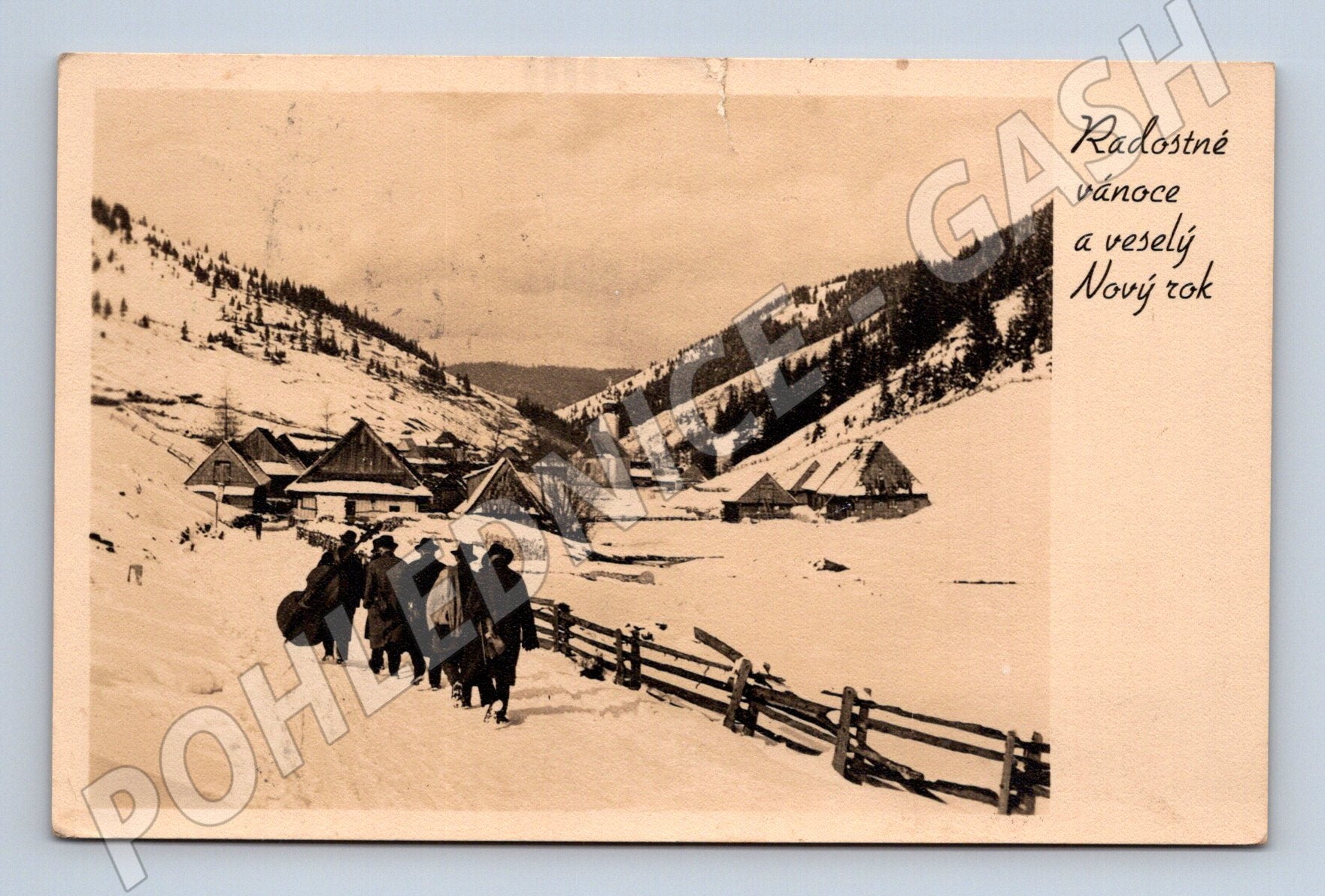 Originální stará pohlednice s vánočním a novoročním přáním Radostné vánoce a veselý Nový rok . Na přední straně je černobílá zimní scénka s vesnickou krajinou, skupinou postav a chalupami zasypanými sněhem. V pozadí zasněžené kopce a po pravé straně vesnická zástavba. Zadní strana je popsána, opatřena poštovní známkou z období Československa a prošla poštou. Jedná se o malý formát z období první poloviny 20. století. Pohlednice je vhodná pro sběratele historických nebo tematických vánočních a zimních pohlednic.