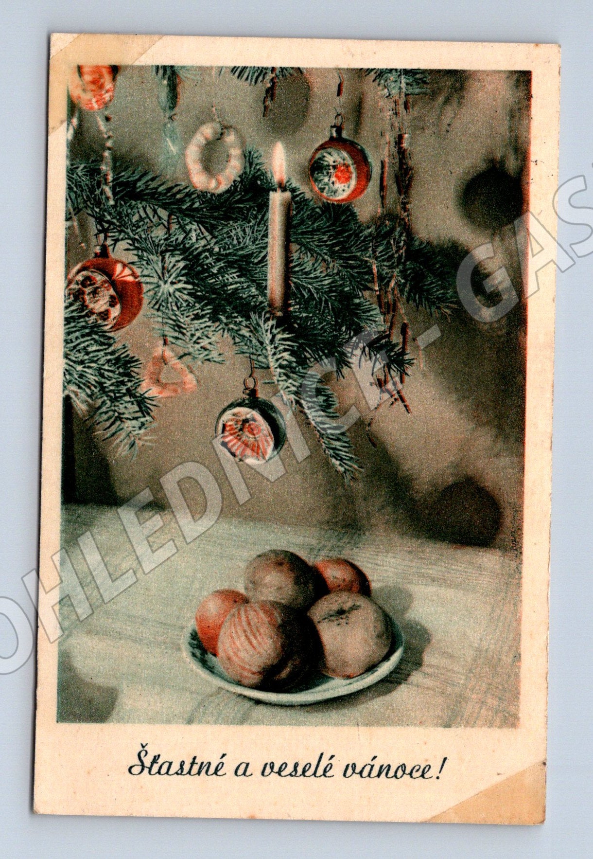 Originální vánoční pohlednice z období první poloviny 20. století, odeslaná z Prahy a opatřená dobovou známkou s portrétem prezidenta. Na přední straně je barevný motiv vánočního stromku ozdobeného tradičními baňkami, stuhami a talířem s ovocem, s přáním Šťastné a veselé vánoce! . Ručně psaný pozdrav na zadní straně dokresluje atmosféru tehdejší doby. Pohlednice je v dobrém zachovalém stavu s menším poškozením rohu. Skvělý sběratelský kousek s autentickou patinou a krásnou vánoční tématikou.