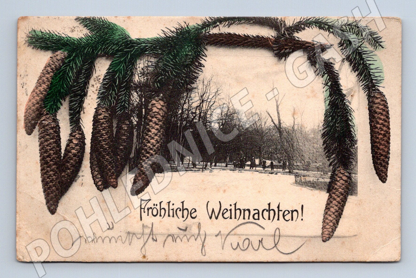 Originální starožitná vánoční pohlednice z Rakouska, datovaná na přelomu 19. a 20. století. Přední strana pohlednice zobrazuje zimní park s pohledem na větve smrku s šiškami a nápisem Fröhliche Weihnachten! (Veselé Vánoce). Pohlednice je ručně popsána a opatřena rakouskou známkou v hodnotě 5 heller. Na zadní straně jsou adresní a korespondenční údaje, včetně starého poštovního razítka. Unikátní sběratelský kousek vhodný pro milovníky historických pohlednic i vánočních motivů. Stav dle fotografií – známky stáří a používání, drobné stopy opotřebení.