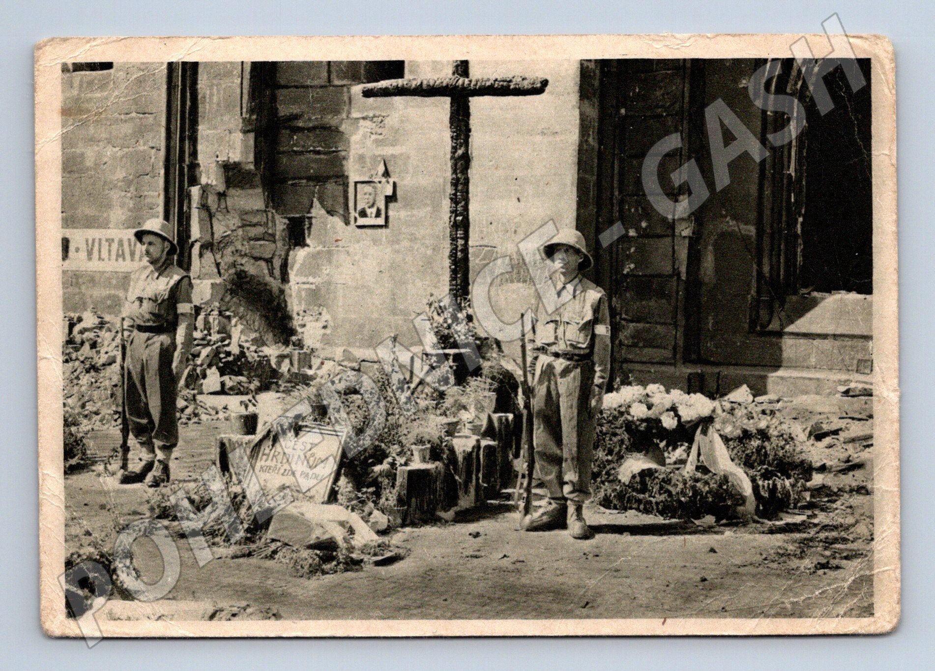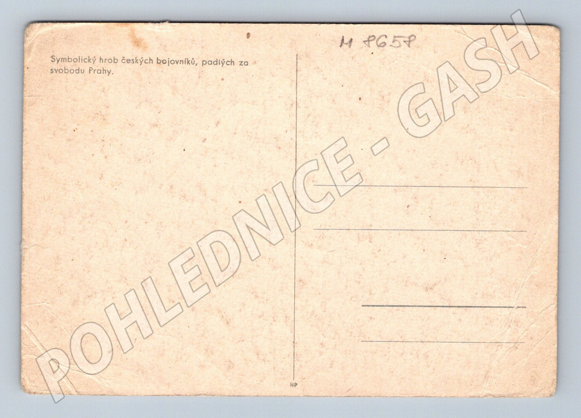 Originální dobová pohlednice s motivem symbolického hrobu českých bojovníků, kteří padli za svobodu Prahy. Pohlednice zachycuje pietní místo s dvěma muži ve vojenských uniformách, křížem a květinami, v pozadí je patrná poškozená budova. Na zadní straně je text: Symbolický hrob českých bojovníků, padlých za svobodu Prahy. Pohlednice nese znaky stáří, mírně opotřebované rohy a lehké zašpinění. Vzácný historický sběratelský kousek, vhodný pro milovníky historie, 2. světové války a památek Prahy.