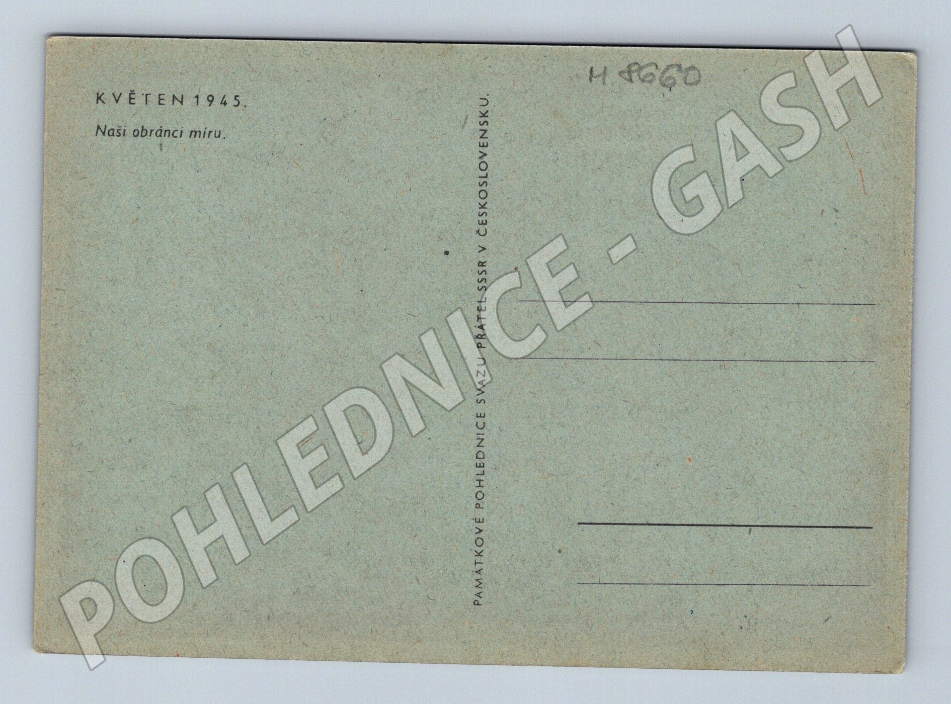 Originální pamětní pohlednice z května 1945 s názvem Naši obránci míru . Na pohlednici je vyobrazen tank vjíždějící do města za podpory davu civilistů, což evokuje osvobození Československa na konci druhé světové války. Pozadí tvoří poničené městské budovy a slavnostní atmosféra vítání osvoboditelů. Text na zadní straně: KVĚTEN 1945. Naši obránci míru. a poznámka PAMĚŤOVÉ POHLEDNICE SVAZU PŘÁTEL SSSR V ČESKOSLOVENSKU . Pohlednice je velmi pěkným historickým artefaktem, vhodná do sbírky vojenských či dobových pohlednic.