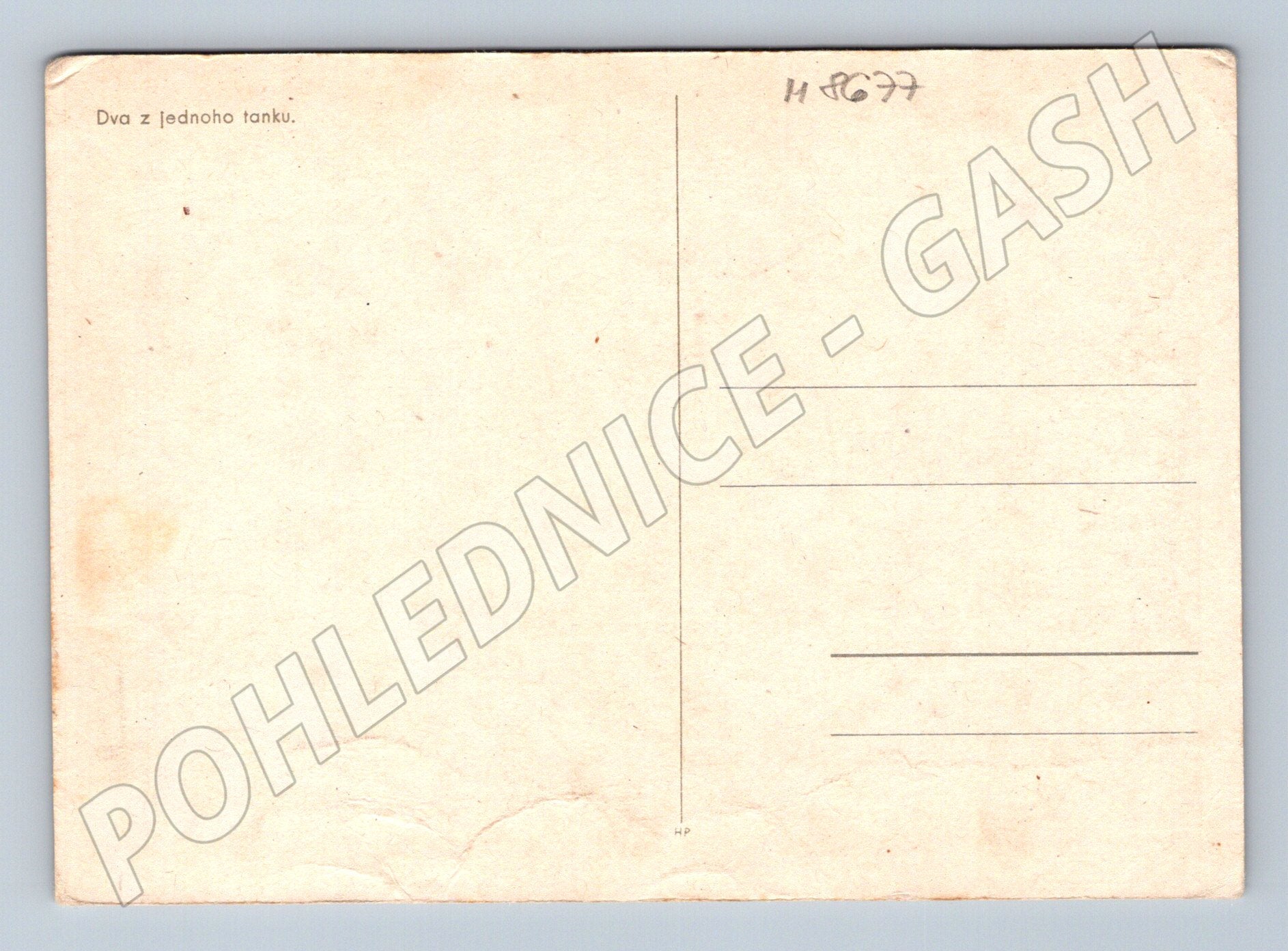 Nabízím originální dobovou pohlednici s názvem Dva z jednoho tanku . Na fotografii je zachycen voják v tankistické přilbě spolu s dívkou ve slavnostním kroji během slavnostní události. Pohlednice nese silnou atmosféru poválečných let a je vytištěna v černobílém provedení. Zadní strana je čistá, bez zápisu, s předtištěným názvem a linkami na adresu. Vhodné pro sběratele historických pohlednic či zájemce o tematiku osobností a vojenské historie. Stav viz foto.