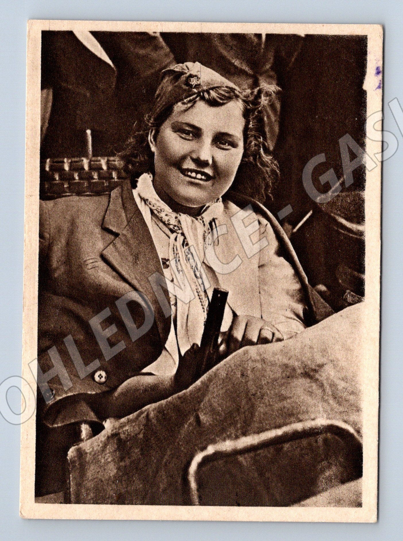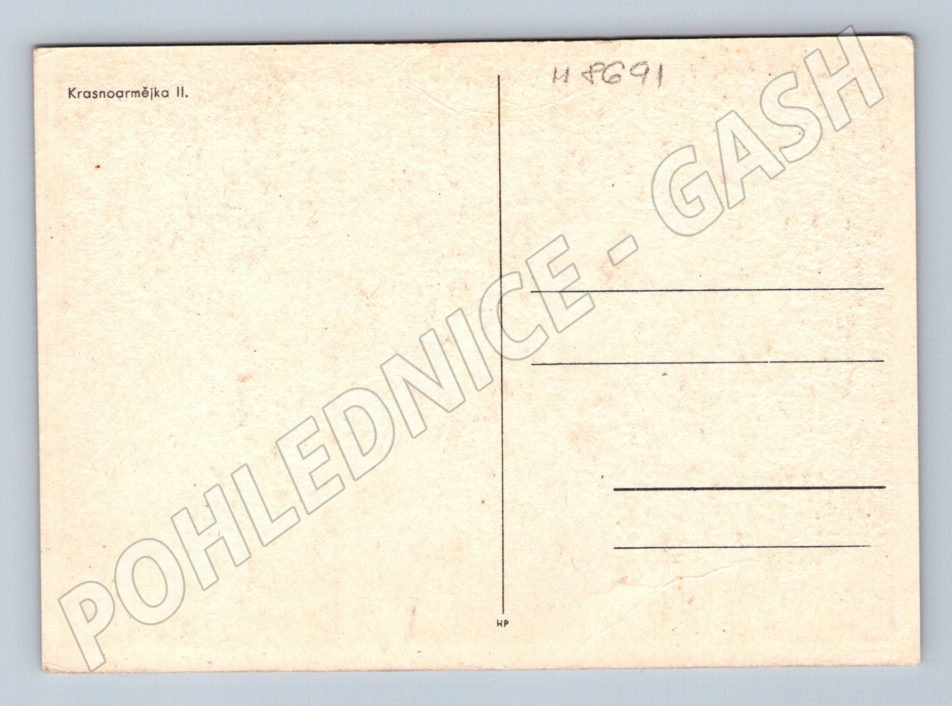 Nabízím originální starou pohlednici s názvem Krasnoarmějka II. Pohlednice zachycuje portrét mladé ženy v armádní uniformě s dobovým účesem a úsměvem, pravděpodobně příslušnice Rudé armády. Jedná se o klasickou černobílou pohlednici formátu odpovídajícího období kolem druhé světové války. Zadní strana je nepopsaná, pouze s nápisem Krasnoarmějka II. . Pohlednice je v pěkném stavu, jen s mírnými známkami stáří a opotřebení. Ideální přírůstek do sbírky militaria, historických pohlednic nebo sběratelských předmětů z období SSSR.
