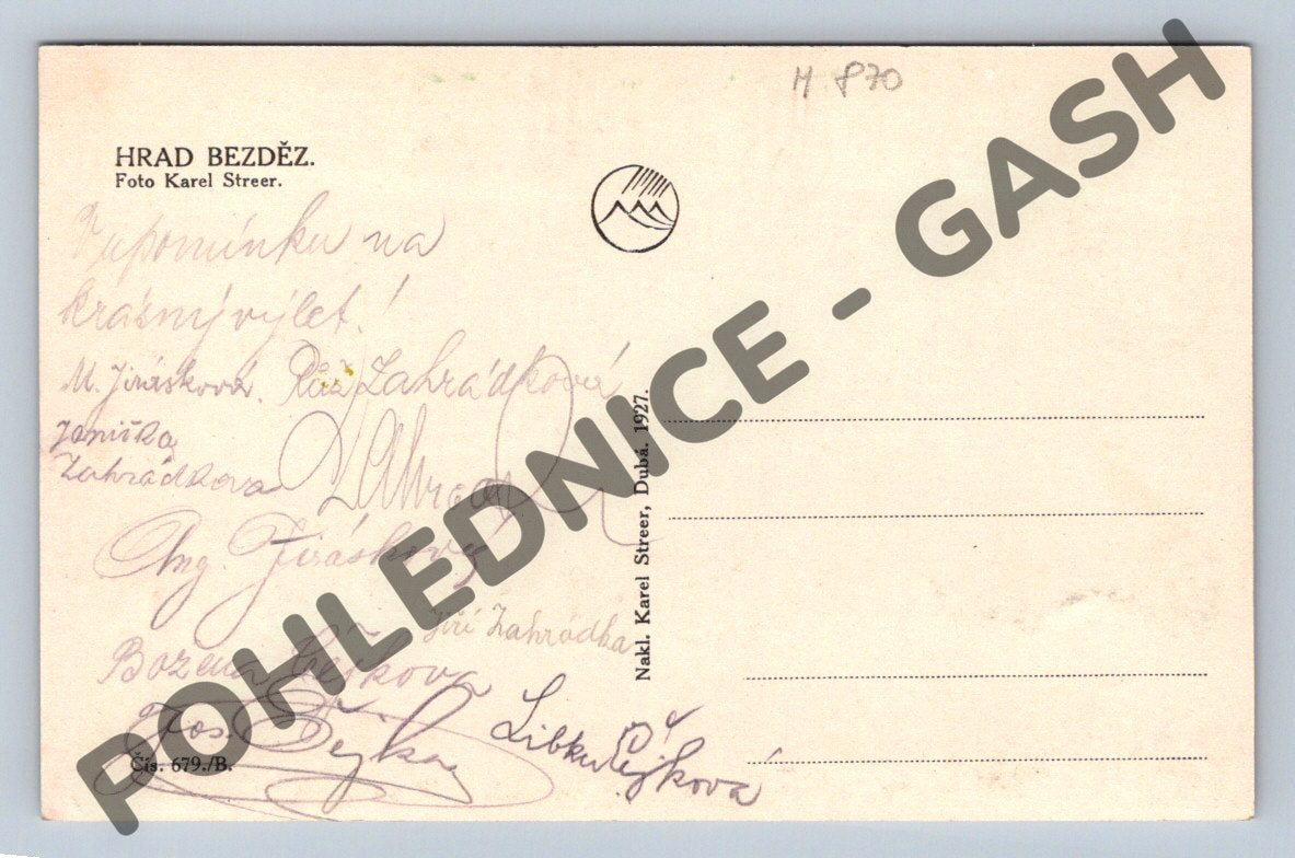 Originální černobílá pohlednice s motivem hradu Bezděz, fotografie Karel Streer. Pohlednice zachycuje pohled na hrad stojící na kopci s okolní krajinou a venkovskými domky. Na zadní straně pohlednice je věnování a podpisy, ručně psané perem, což přidává na historické a sběratelské hodnotě. Vhodné pro sběratele historických pohlednic hradů a českých památek. Celkově dobrý stav, viz foto.