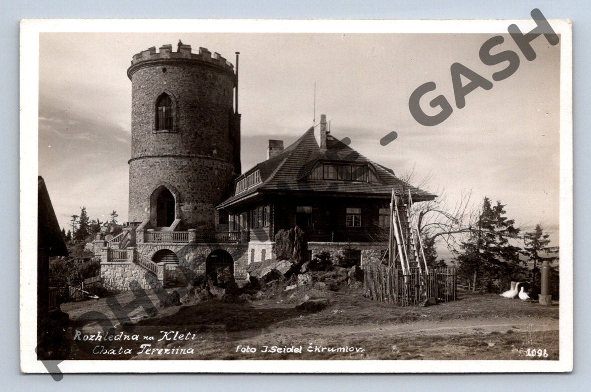 Originální historická pohlednice zobrazující rozhlednu na Kleti a chatu Tereziinu. Snímek pořídil známý fotograf J. Seidel z Českého Krumlova. Na pohlednici je zachycena kamenná rozhledna spolu s turistickou chatou v krásné přírodní scenérii. Jedná se o nepsanou pohlednici ve velmi dobrém stavu, vhodnou pro sběratele i milovníky Šumavy a českých rozhleden. Na zadní straně je částečně patrný razítkový otisk. Ideální přírůstek do vaší sbírky!