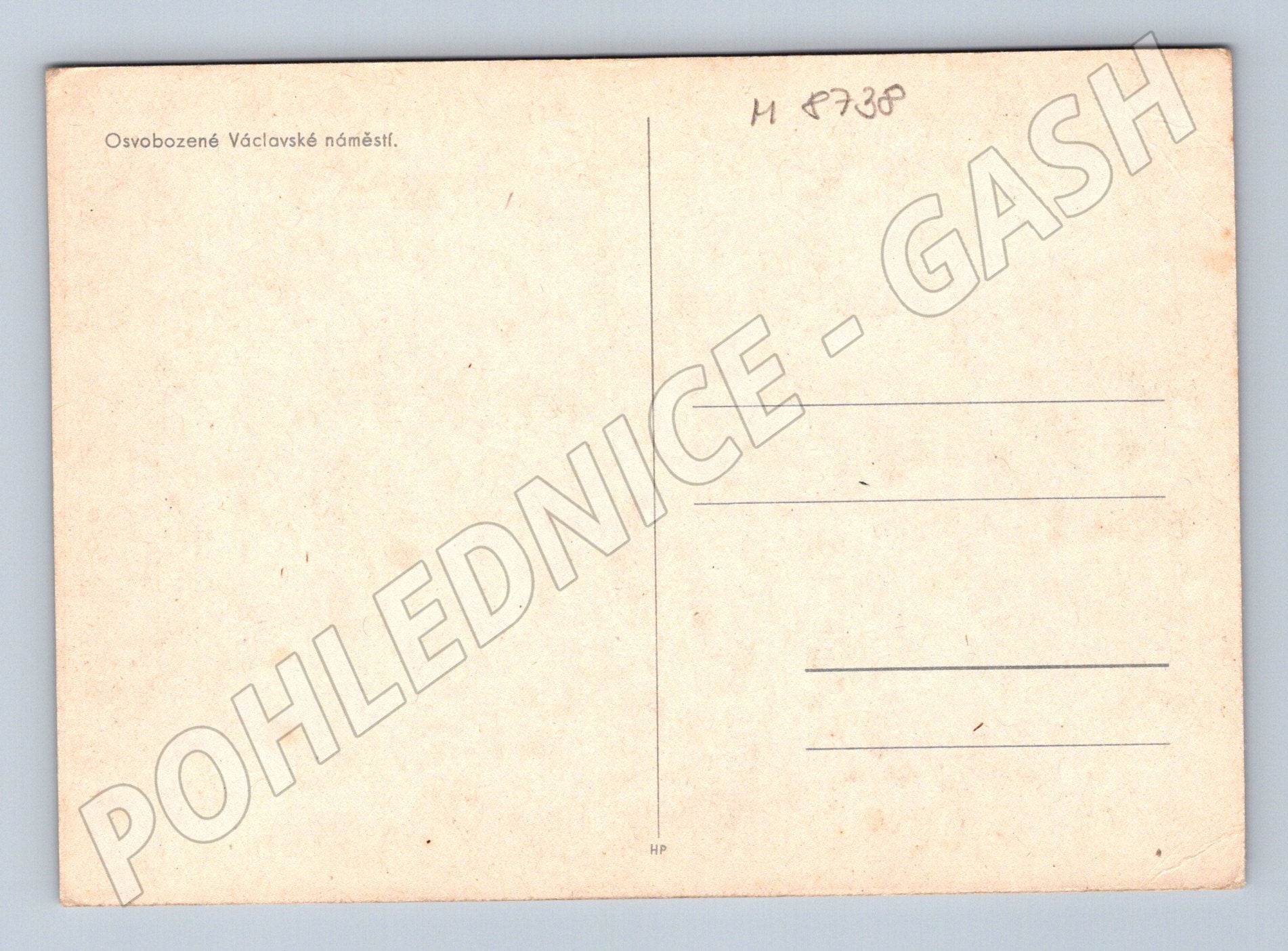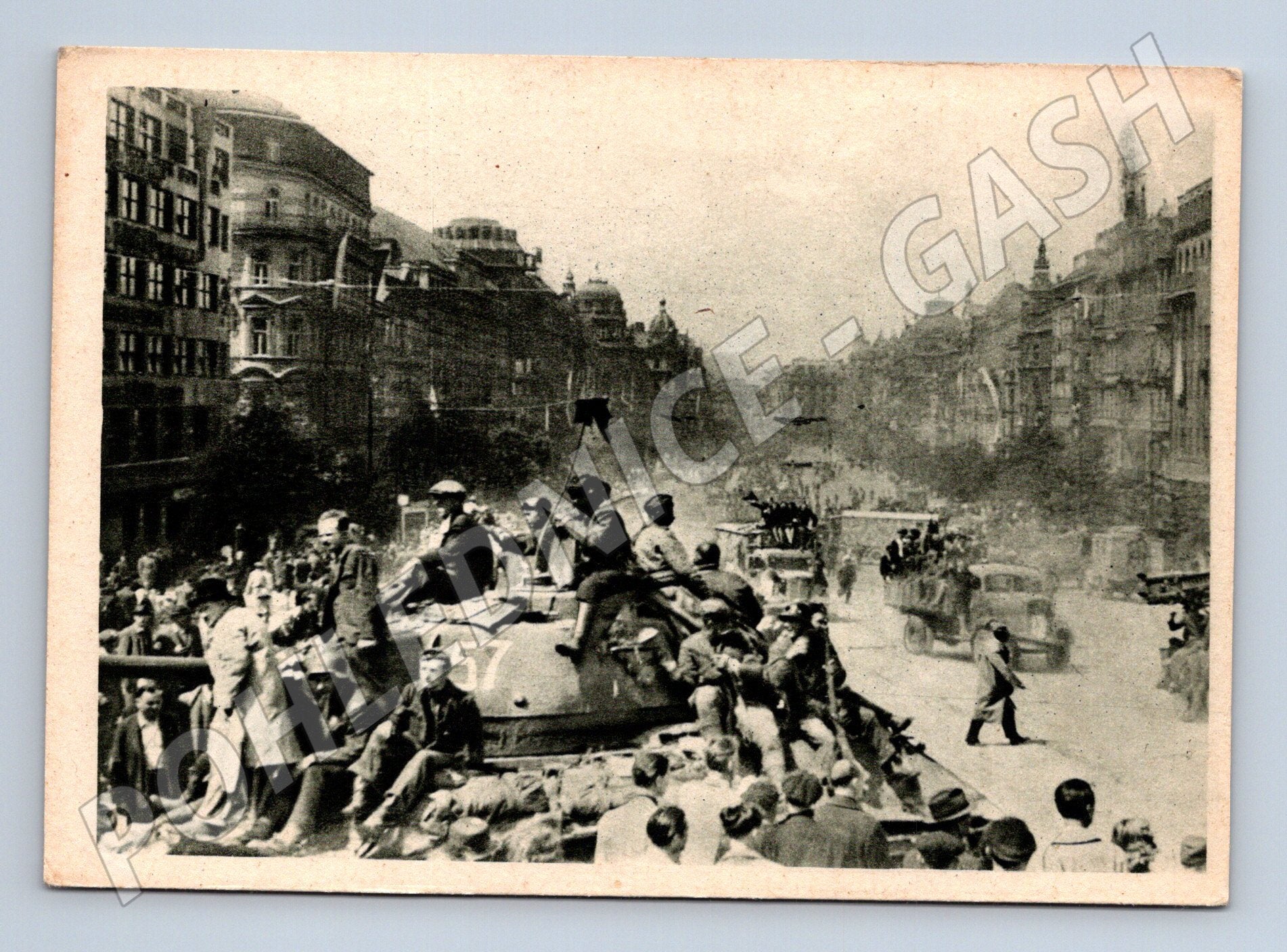 Historická pohlednice zachycující osvobozené Václavské náměstí v Praze. Černobílá fotografie z období konce druhé světové války, zřejmě rok 1945, kdy ulicemi projížděly osvobozenecké tanky a lidé vítali vojska. Pohlednice má klasické rozdělení na zadní straně pro adresu a text, v levém horním rohu je text Osvobozené Václavské náměstí . Výborná dobová dokumentace atmosféry Prahy při osvobozování. Pěkný dochovaný stav, vhodné pro sběratele historických pohlednic či zájemce o dějiny 20. století.