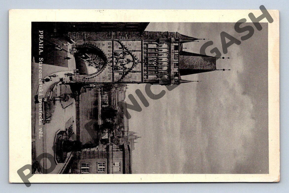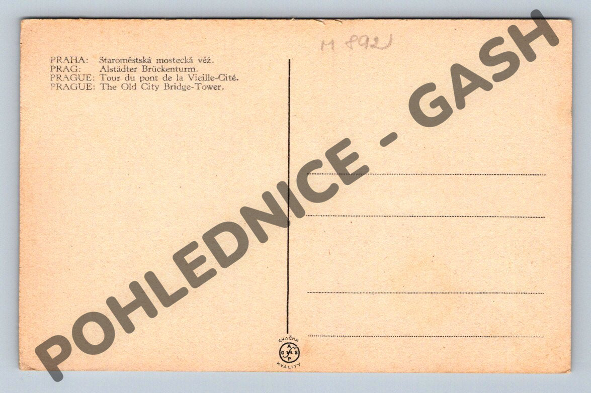 Originální černobílá pohlednice zachycující Staroměstskou mosteckou věž v Praze. Jedná se o historickou pohlednici menšího formátu, vydanou před rokem 1950. Na přední straně je pohled na slavnou věž u Karlova mostu a část Malé Strany. Zadní strana je neprošlá, čistá, s popisem ve čtyřech jazycích (čeština, němčina, francouzština, angličtina). Ve spodní části je výrobní značka. Pohlednice je ve velmi dobrém stavu, vhodná pro sběratele historických pohlednic Prahy nebo českých památek.