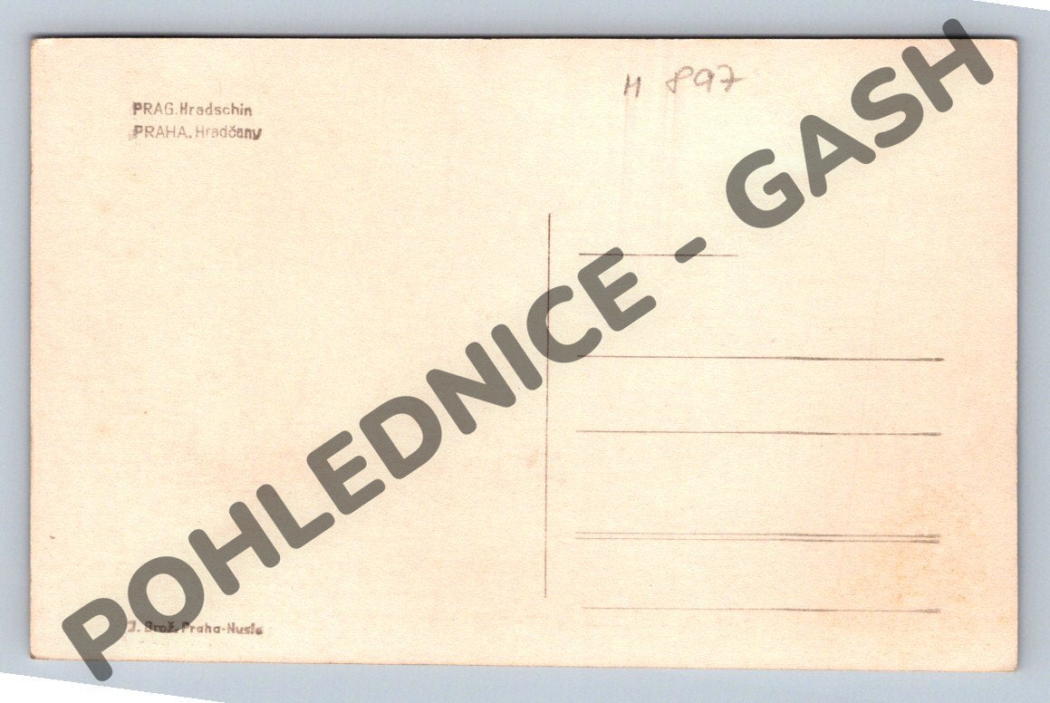 Originální historická pohlednice s pohledem na Prahu a Pražský hrad z ptačí perspektivy. Na přední straně je detailní černobílý snímek ikonické dominanty hlavního města Prahy. Na zadní straně najdete předtištěné místo pro adresu a krátký popis PRAG. Hradschin / PRAHA. Hradčany . Vydal J. Brož, Praha-Nusle. Jedná se o malý formát pohlednice, pravděpodobně z období první poloviny 20. století. Pohlednice je ve velmi dobrém sběratelském stavu, bez známky, čistá, lehce zažloutlý papír odpovídající stáří. Skvělá nabídka pro sběratele historických pražských pohlednic nebo milovníky architektury a historie.
