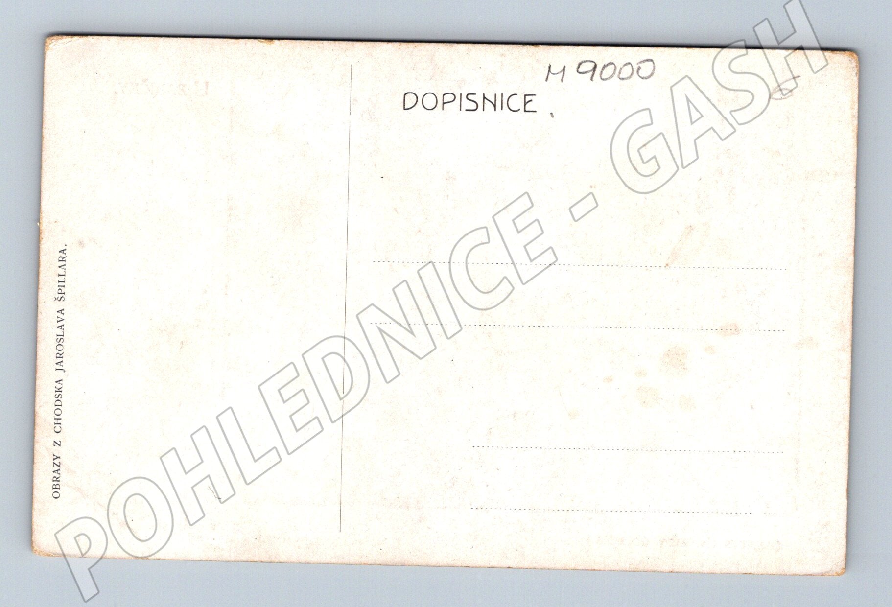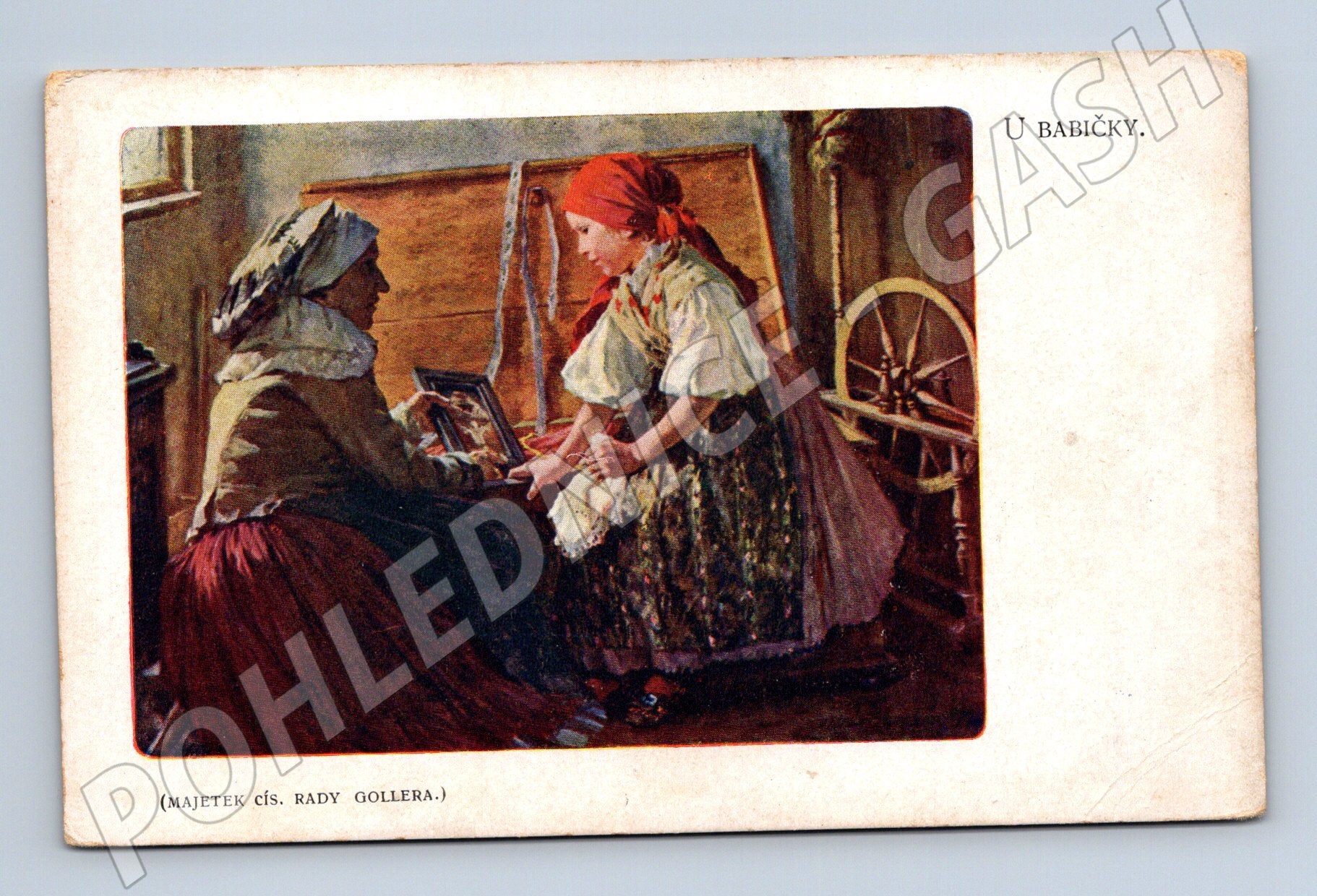 Starobylá pohlednice s názvem U babičky , vycházející z obrazu Jaroslava Špillara, zachycuje tradiční českou venkovskou scénu: žena v kroji sedí se starší paní u kolovrátku. Pohlednice přibližuje atmosféru venkova a tradiční hodnoty prostřednictvím originálního etnografického zobrazení. Na zadní straně je označení OBRAZ Z CHODSKA JAROSLAVA ŠPILLARA . Pohlednice je ve sběratelském stavu, neprošlá poštou. Vhodná pro milovníky etnografie či sběratele historických pohlednic.