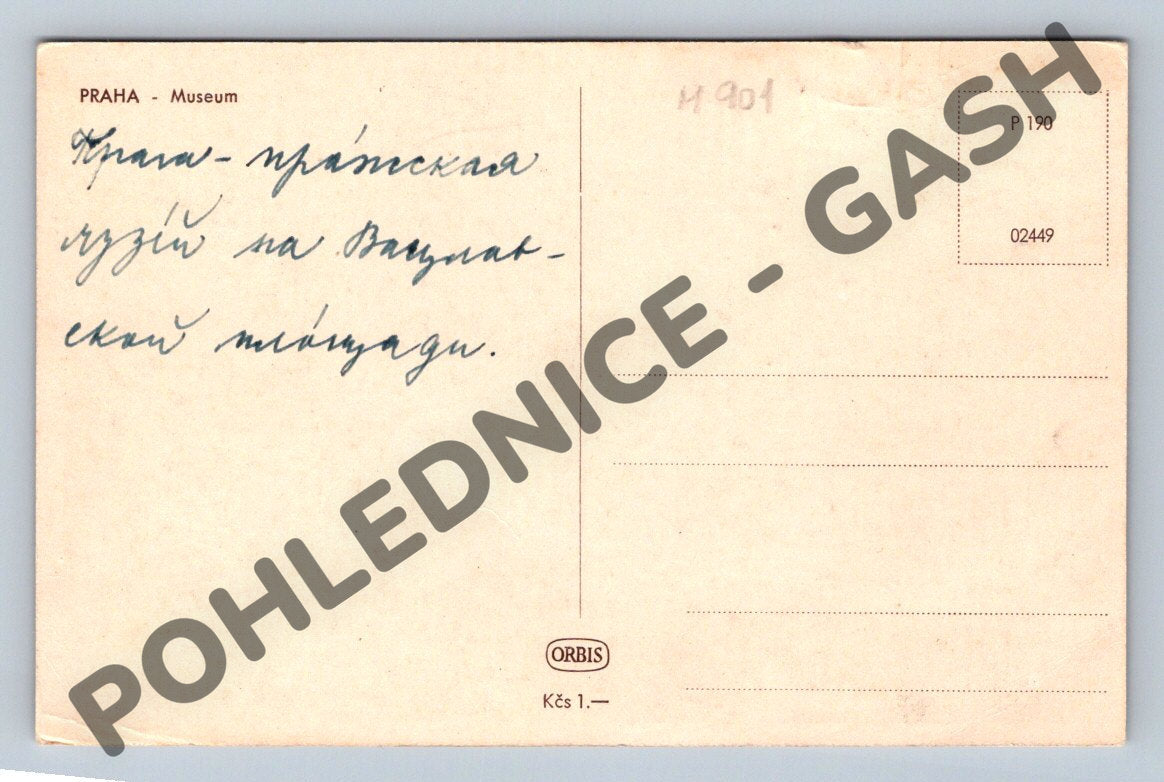 Historická pohlednice zachycující Národní muzeum v Praze a část Václavského náměstí, zřejmě z první poloviny 20. století. Na pohlednici je vidět typický městský ruch té doby – tramvaj, povozy a chodci. Na zadní straně je ručně psaný vzkaz v ruštině. Vydal Orbis, označení KČs 1,-, číslo 02449. Pohlednice je ve velmi dobrém sběratelském stavu, s drobnými známkami stáří. Skvělý kousek pro sběratele historických pohlednic Prahy.