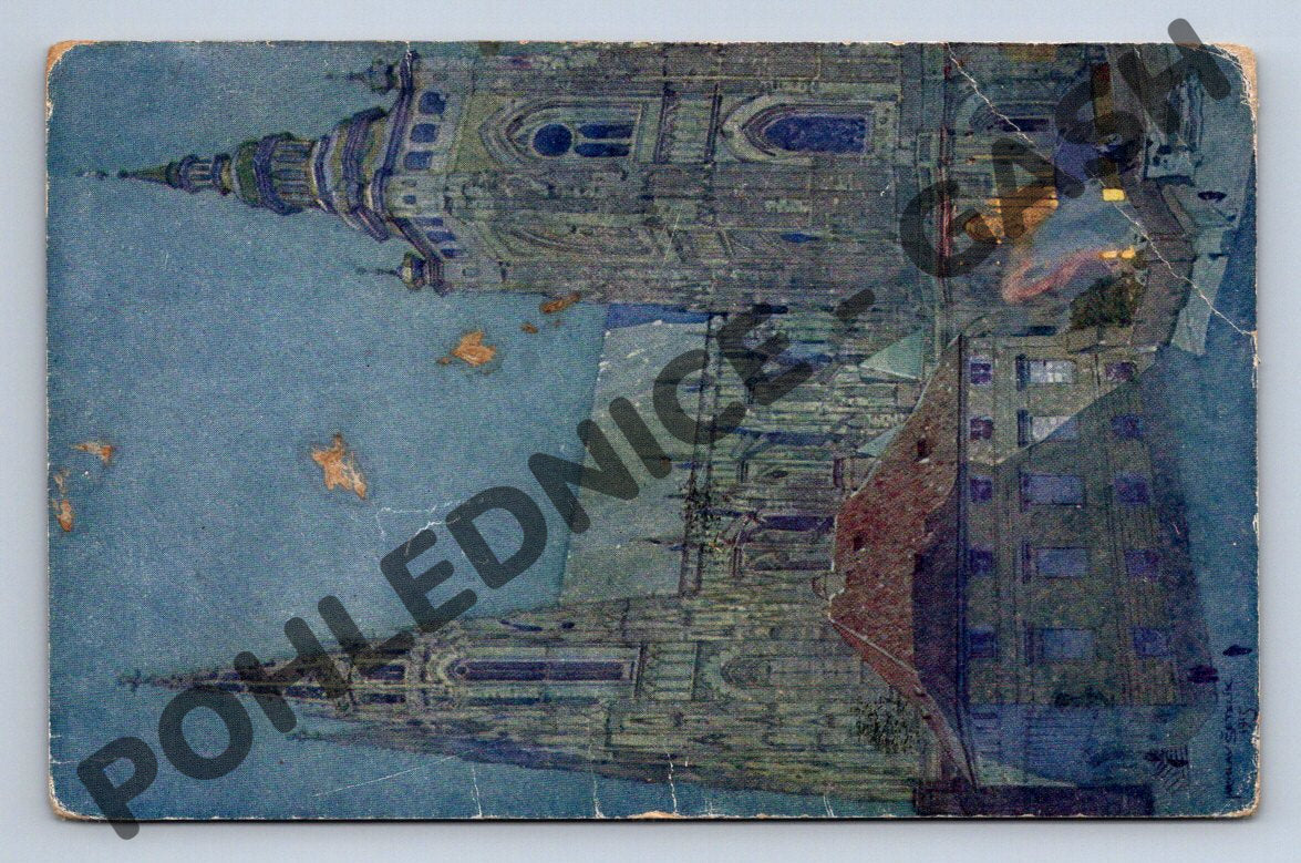 Originální stará pohlednice Chrámu svatého Víta v Praze. Na přední straně se nachází malířské ztvárnění dominantní stavby pražského Hradu. Pohlednice je prošlá poštou, s poštovní známkou a razítkem. Na zadní straně je ručně psaný text adresovaný slečně Sláva Bačanové. Stav pohlednice odpovídá stáří – místy jsou známky opotřebení, drobné trhliny a oděrky na hranách. Skvělý sběratelský kousek pro milovníky historické Prahy a architektury.