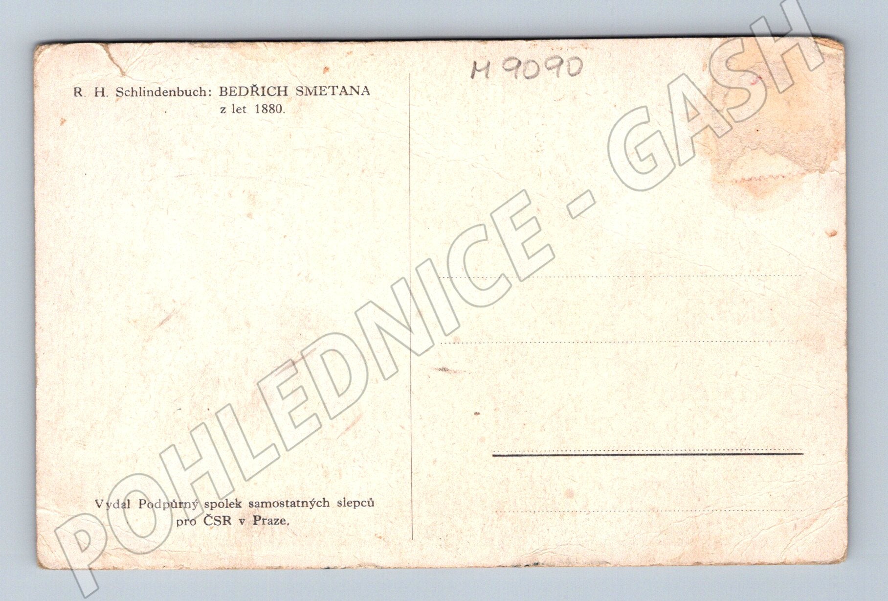 Starší pohlednice s portrétem Bedřicha Smetany z let 1880 podle obrazu R. H. Schlindenbucha. Pohlednici vydal Podpůrný spolek samostatných slepců pro ČSR v Praze. Pohlednice nese patrné známky stáří a používání – rohy jsou otřepené, místy znečištěná a s několika skvrnami. Na přední straně je ručně psaný podpis. Zadní strana je rozdělena pro adresu a zprávu, s textem upřesňujícím vydavatele. Ideální pro sběratele historických pohlednic a zájemce o osobnosti české hudby.