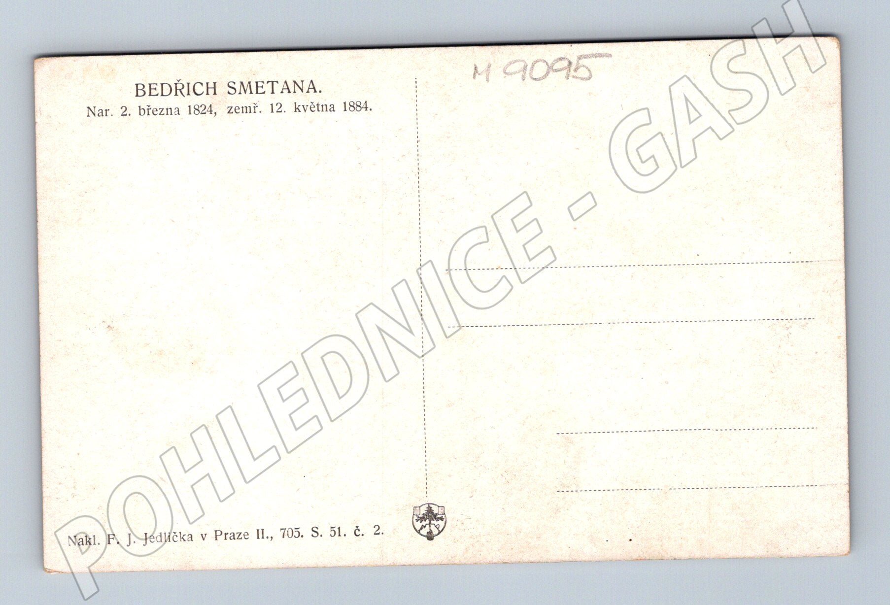Historická pohlednice s portrétem Bedřicha Smetany, významného českého hudebního skladatele. Na přední straně je vyobrazen barevný portrét této slavné osobnosti. Zadní strana obsahuje tisk BEDŘICH SMETANA, Nar. 2. března 1824, zemř. 12. května 1884 a vydavatelské údaje Nakl. F. J. Jedlička v Praze II., 705. S. 51. č. 2. Pohlednice je ve slušném stavu, mírné známky opotřebení odpovídající stáří. Velmi zajímavý sběratelský kousek pro milovníky hudby, historie nebo české osobnosti.