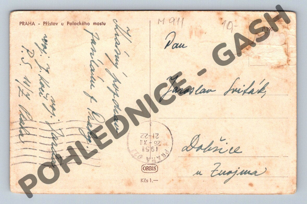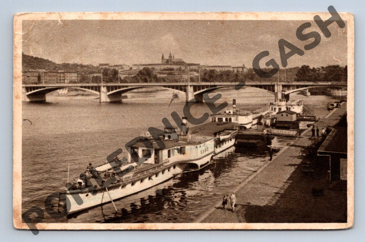 Originální stará pohlednice s motivem přístavu u Palackého mostu v Praze. Na přední straně jsou zachyceny říční parníky a lodě kotvící u břehu Vltavy, v pozadí je vidět Palackého most a panorama Prahy. Pohlednice byla odeslaná, na zadní straně je ručně psaný text, známka byla odstraněna. Pohlednice nese známky stáří – mírné opotřebení, místa lehce ohnutá, drobné flíčky. Krásný historický sběratelský kousek vhodný do sbírky pohlednic s tematikou Prahy a vodní dopravy.