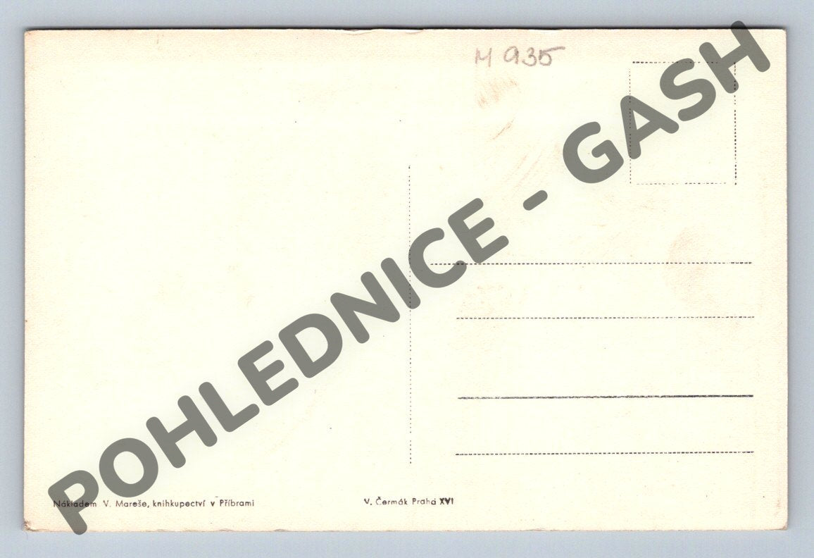 Starší černobílá pohlednice zachycující Svatou Horu u Příbrami. V popředí je uveden exerciční dům, na pozadí dominuje barokní poutní areál Svatá Hora, jeden z nejznámějších mariánských poutních míst v České republice. Pohlednice je neprošlá poštou, s místem pro známku a adresu, na rubu je označení vydavatele: V. Mareš, knihkupectví v Příbrami. Celkově zachovalý stav, mírné známky stáří, vhodné pro sběratele i jako ukázka regionální historie.