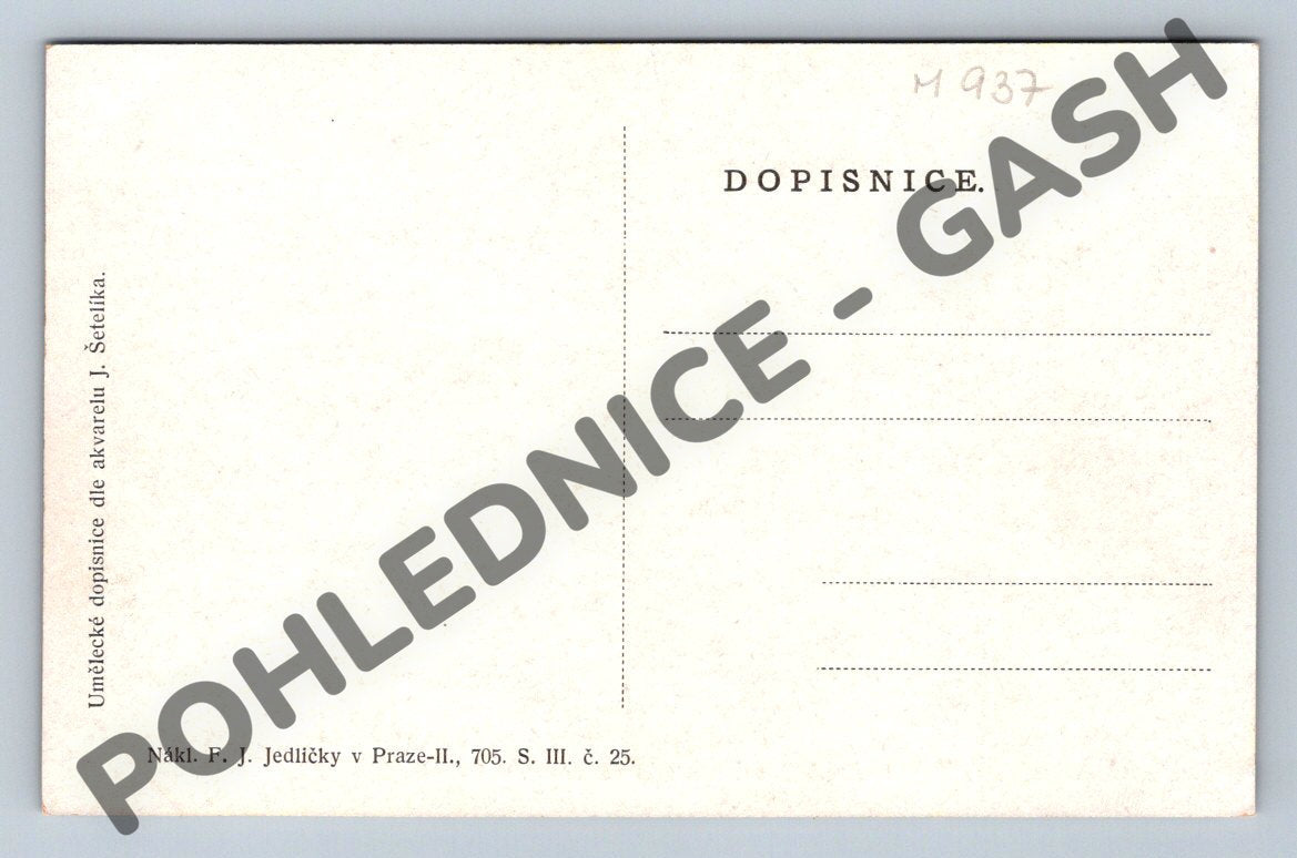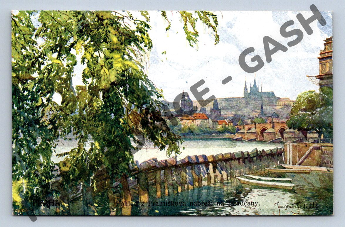 Umělecká pohlednice s motivem Prahy, konkrétně pohledem z Františkova nábřeží na Hradčany a Karlův most. Pohlednice byla vyrobena podle akvarelu J. Šetelíka a vydal ji F. J. Jedlička v Praze. Na líci je krásně zpracované panoráma s Pražským hradem, věžemi a v popředí klidná řeka s loďkou, zelení a částí nábřeží. Pohlednice je neprošlá poštou, čistá, na rubu označeno Dopisnice . Atraktivní sběratelský kousek zobrazující historickou Prahu.