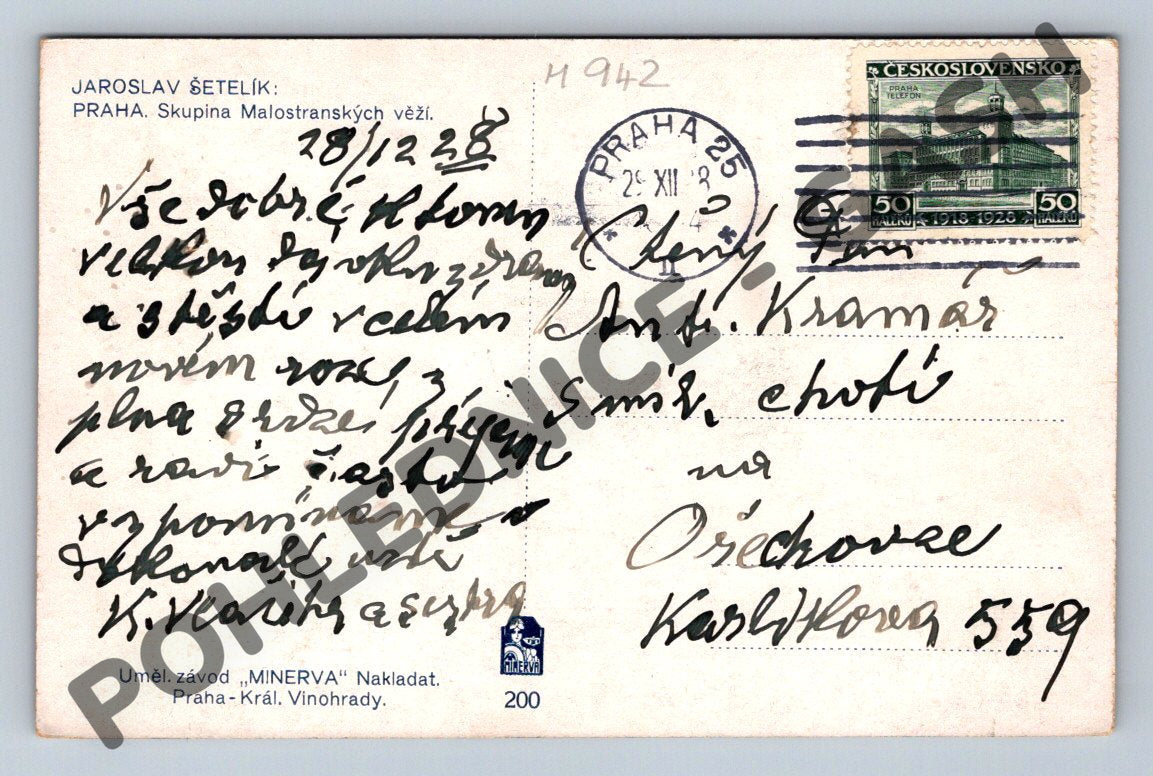 Praha - Malá Strana, věže, 1928, Šetelík, malý formát, zaslaná