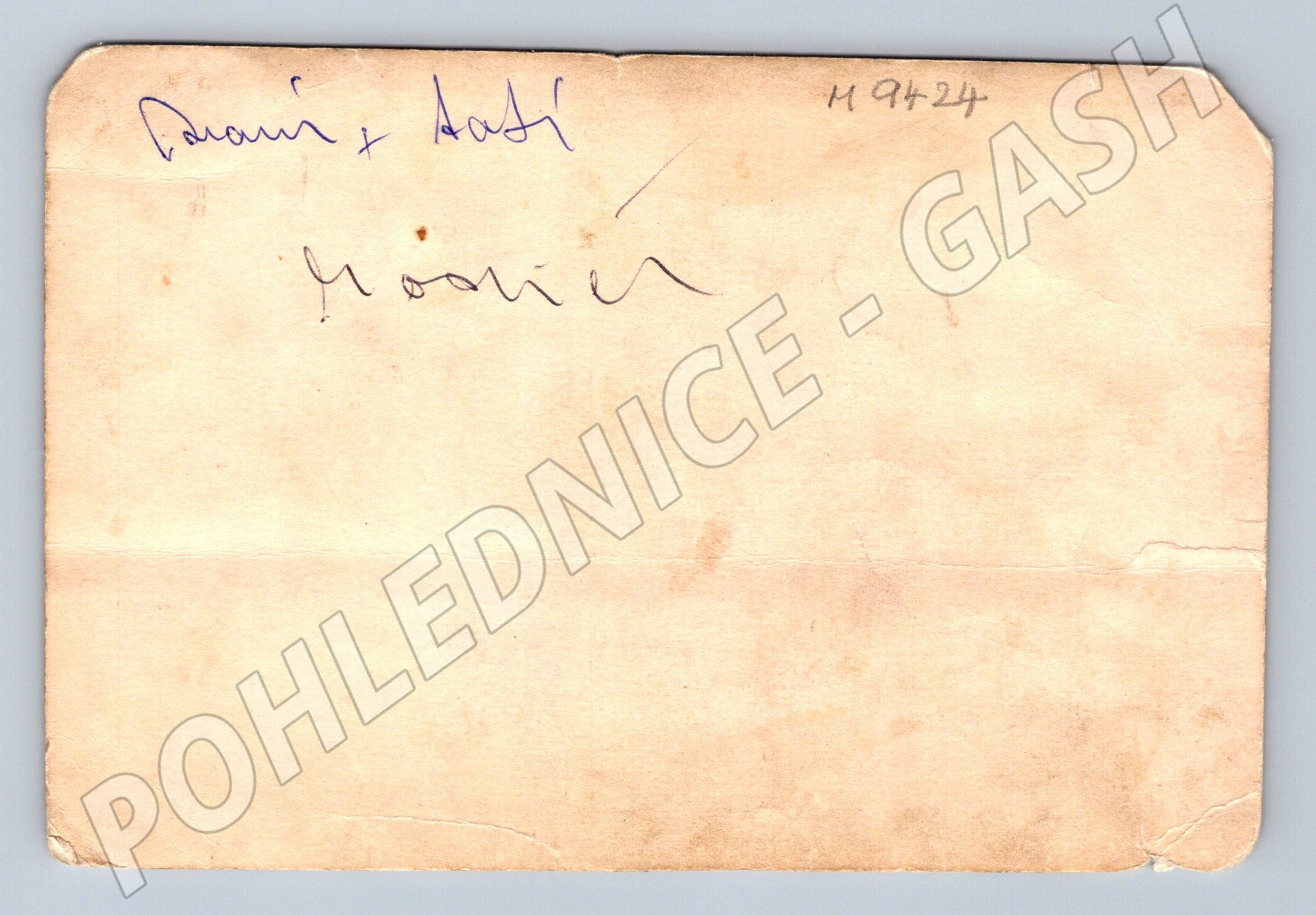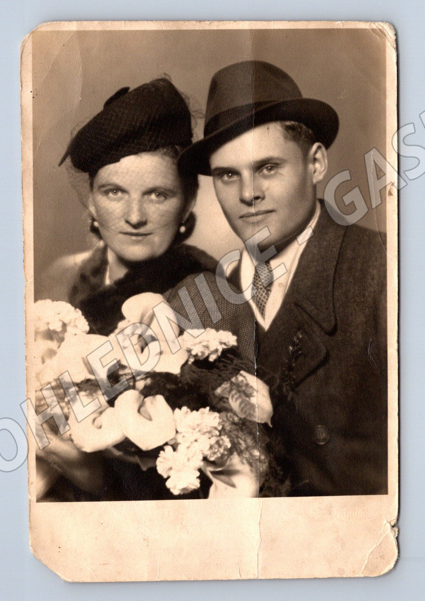 Originální černobílá pohlednice s portrétem muže a ženy elegantně oděných, držících kytici květin. Pohlednice je staršího data, což je patrné z jejího formátu a stylu fotografie. Na zadní straně je ručně psaný vzkaz Mamí + tatí, Yosíci a značení M 94/24. Stav pohlednice odpovídá stáří – rohy jsou ohlé, povrch nese známky opotřebení a je patrné složení uprostřed. Ideální jako sběratelský kus pro milovníky starých portrétů, rodinných vzpomínek nebo dobové fotografie.